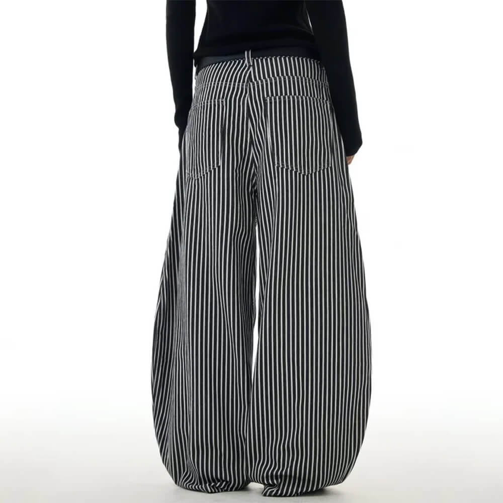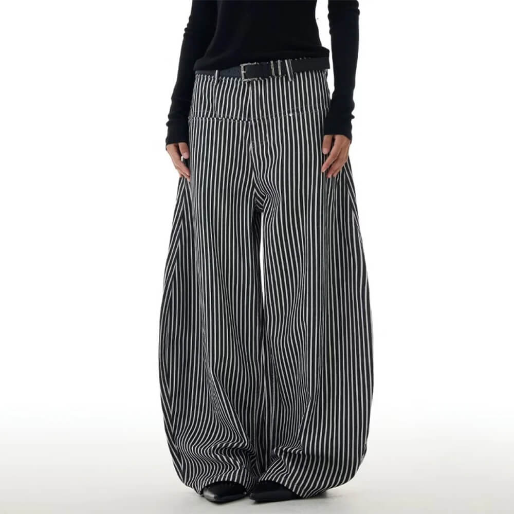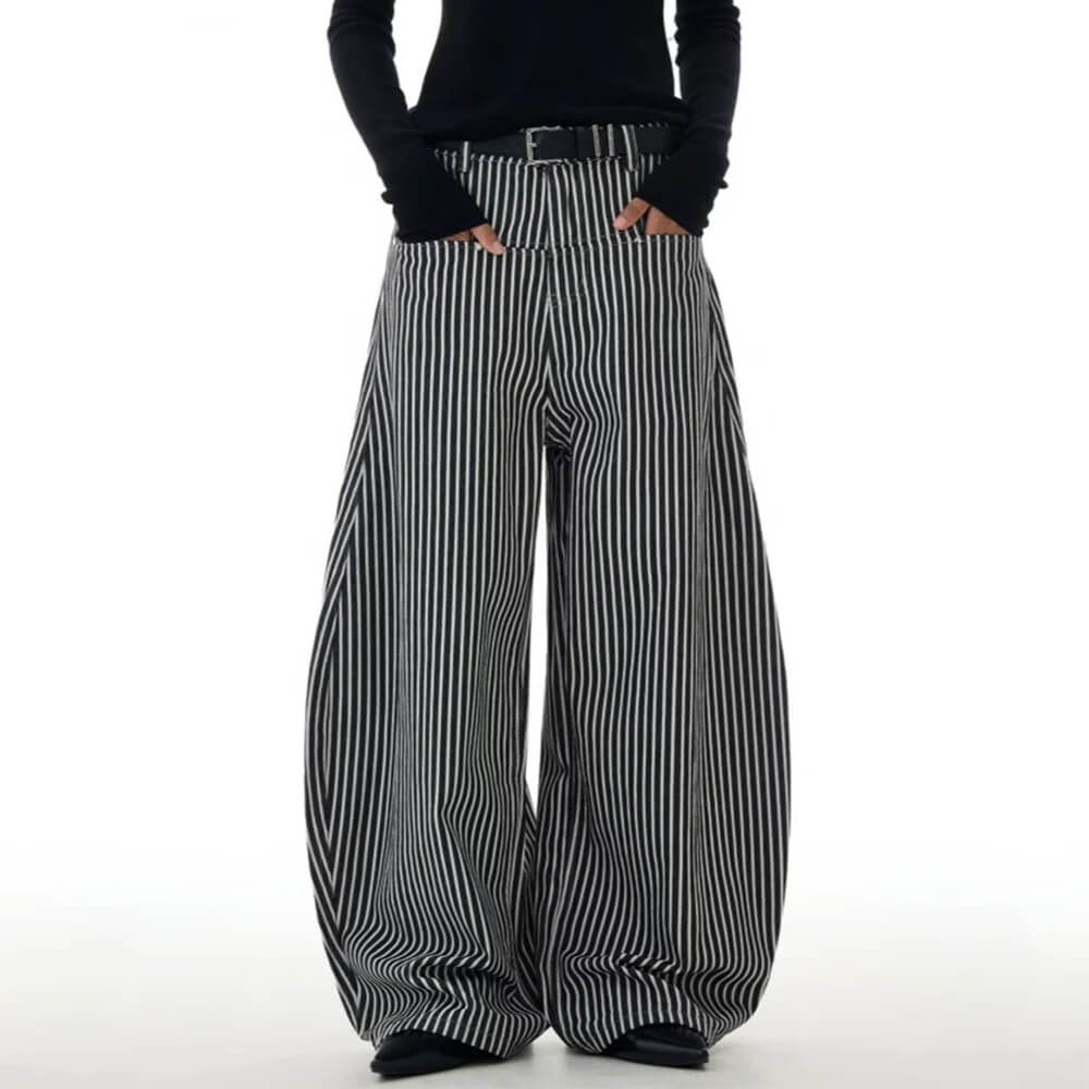 These aesthetic pants feature a vertical striped pattern, oversized wide-leg silhouette, and high-waisted design, perfect for creating dark academia outfits, grunge styling, and statement everyday looks