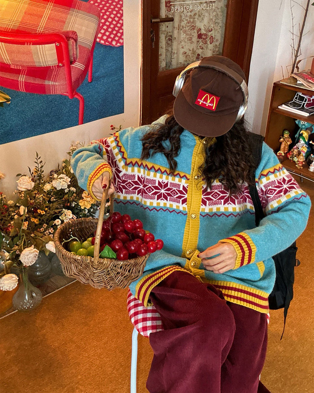 This aesthetic knit cardigan featuring a soft blue base, yellow contrast trim, and hooded design. Decorative fair isle-style stripe across the chest and sleeves in burgundy and white. Front pockets and full button closure