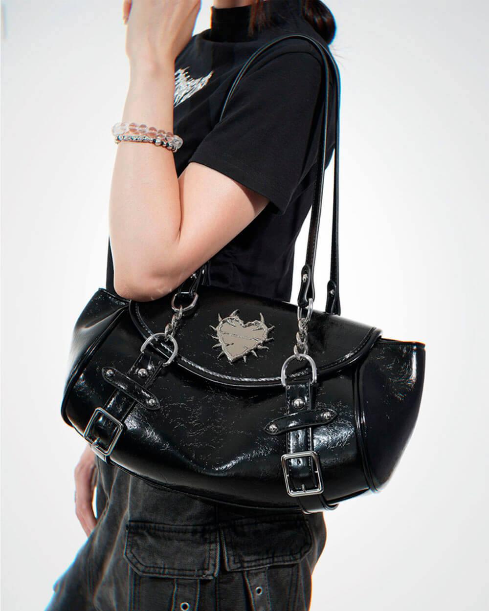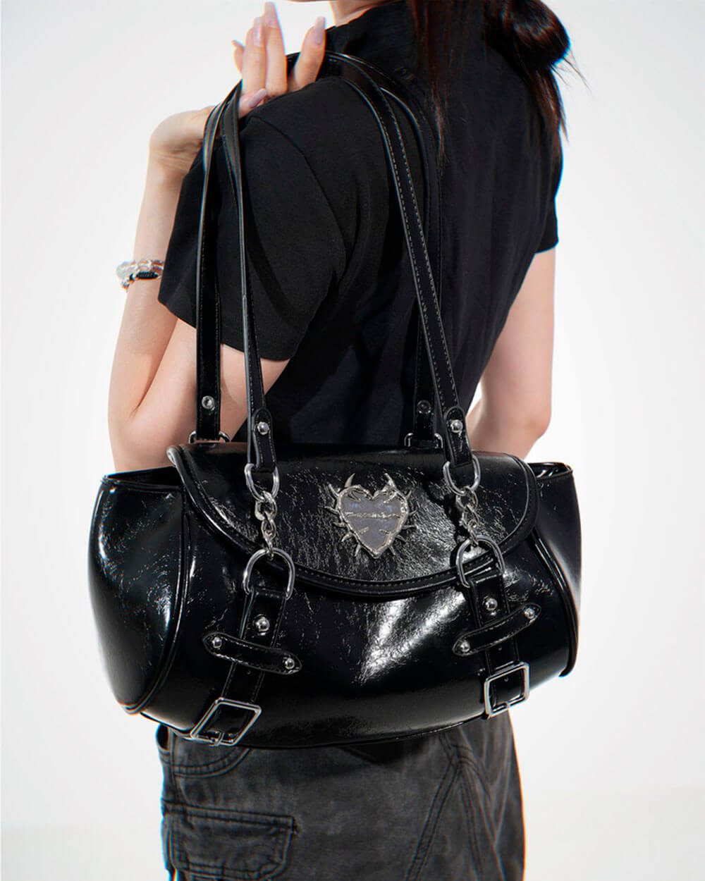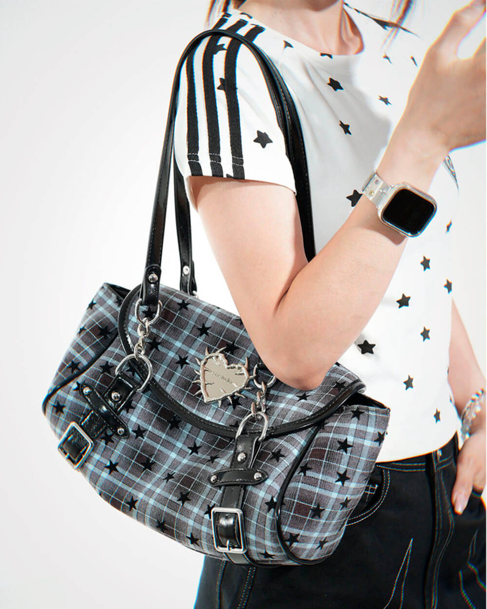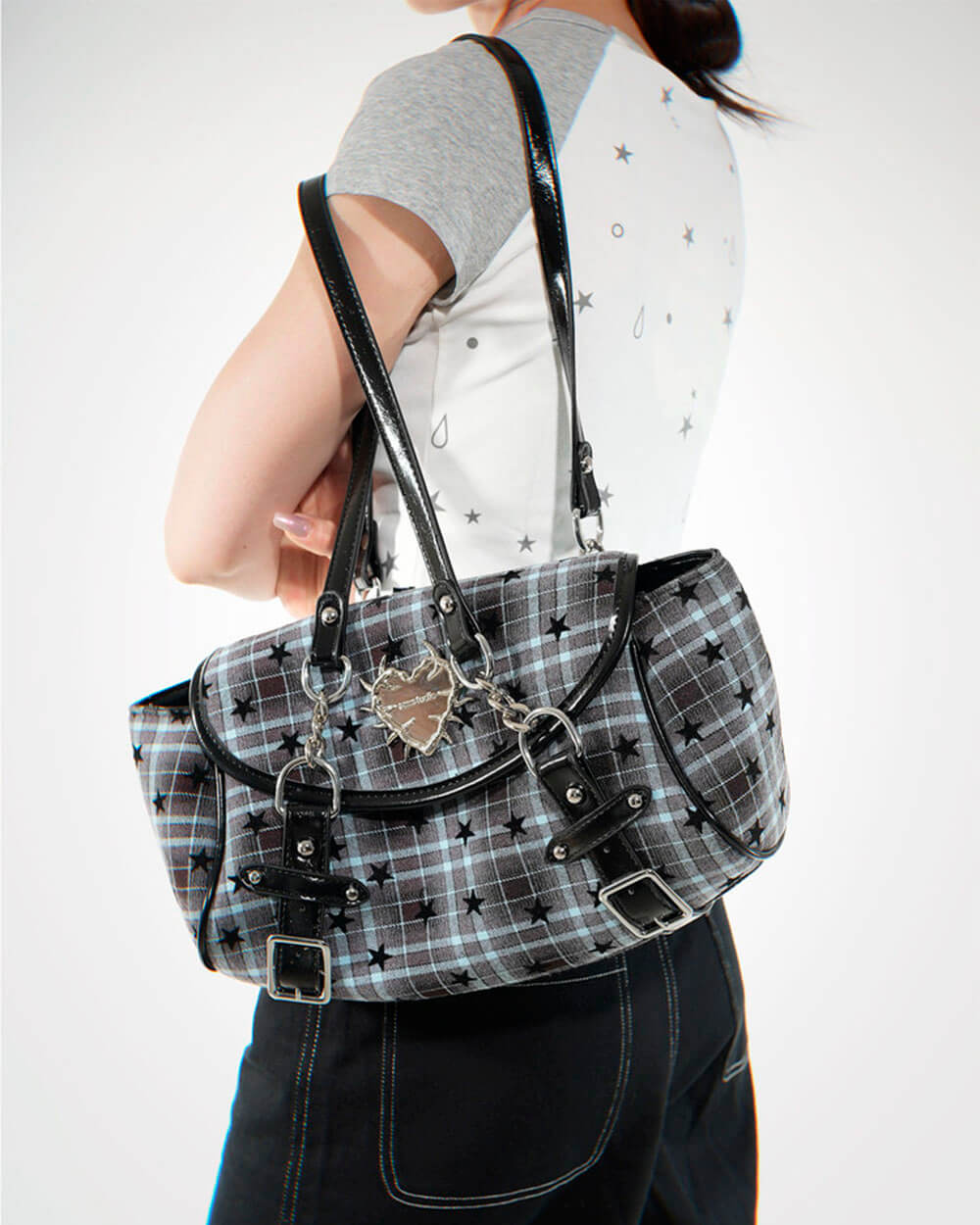 This aesthetic grunge bag featuring a plaid base with spiked heart detail and metal charm accent. Designed with buckle straps, flap closure, and multiple pockets, available in black and blue plaid color options