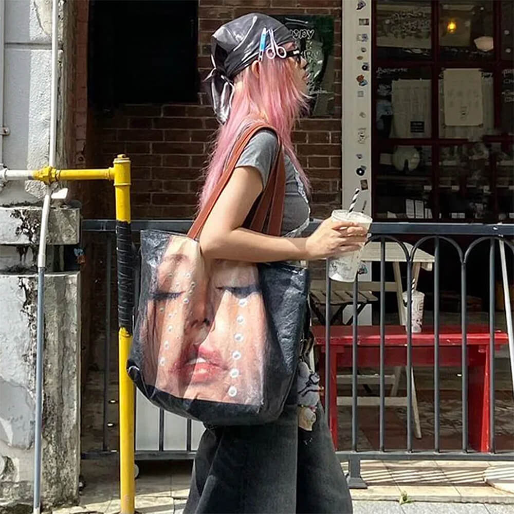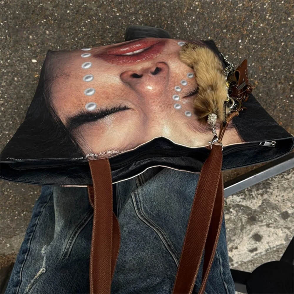 This tote bag featuring crying face print with pearl accents and soft glossy finish. Constructed with large capacity interior and reinforced black handles for comfortable carry
