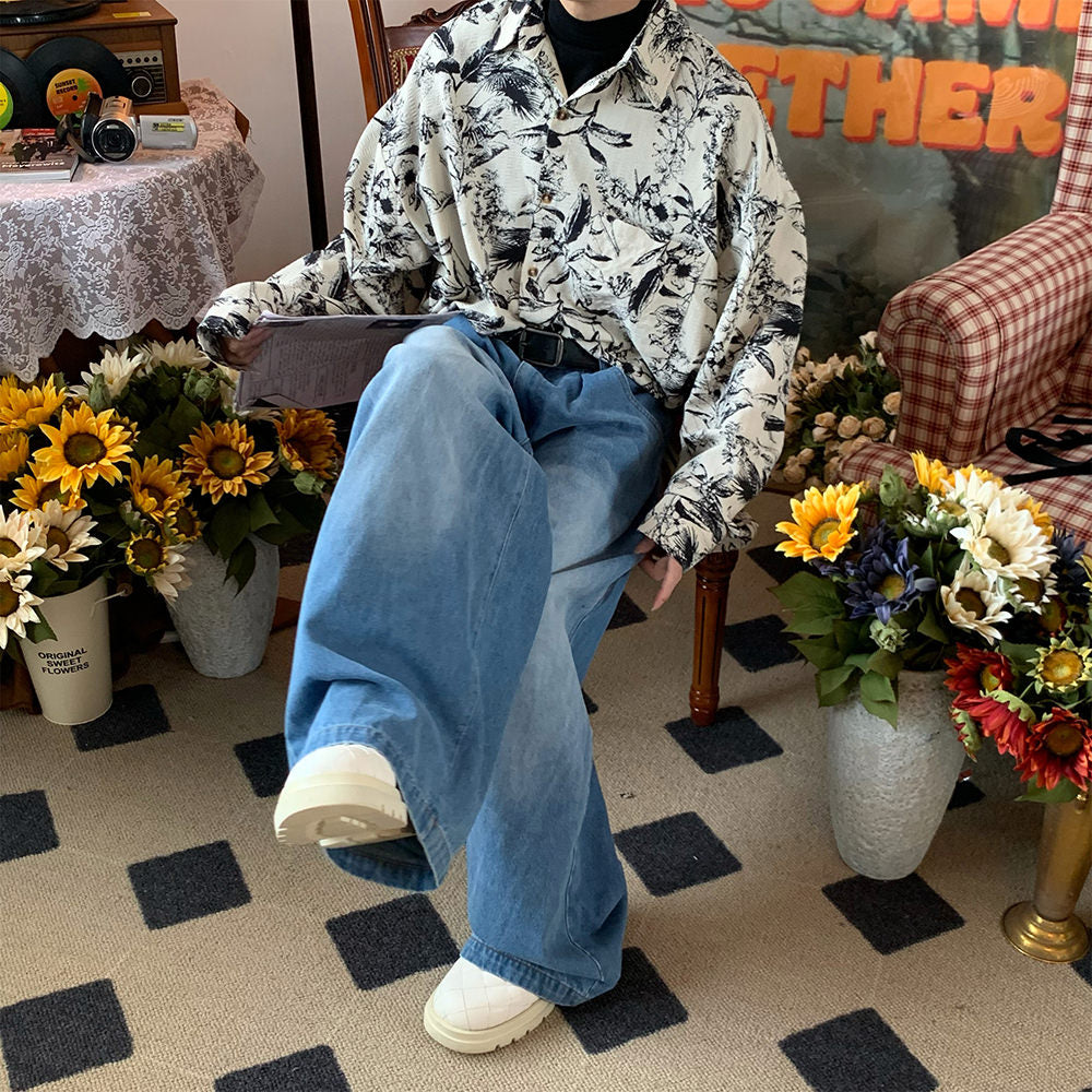 This aesthetic oversized shirt featuring black ink-style floral prints on a soft beige base. Designed with a loose 90s silhouette, drop shoulders, and button-up front, it creates a flowy vintage-inspired look that pairs easily with jeans or wide trousers