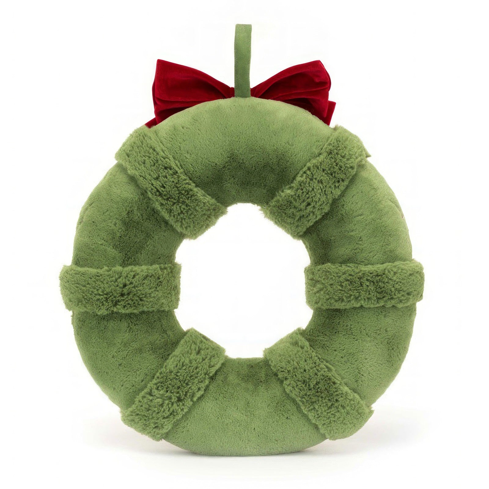 Say hi to your new buddy, Decorated Christmas Wreath Plush Toy, a velvety green wreath dressed in bright red bows and soft golden berries