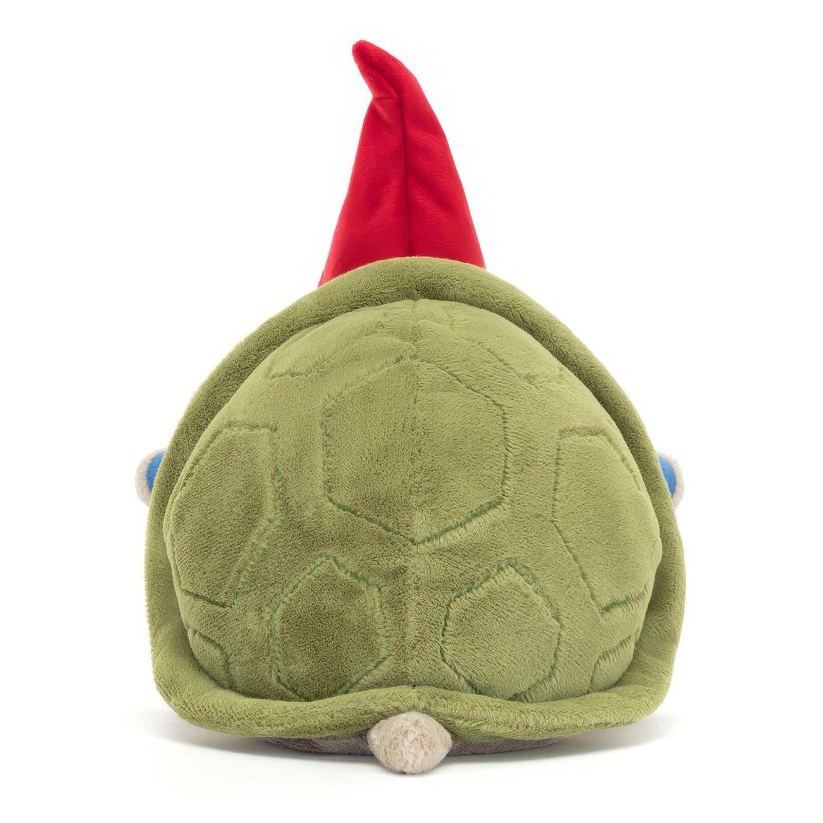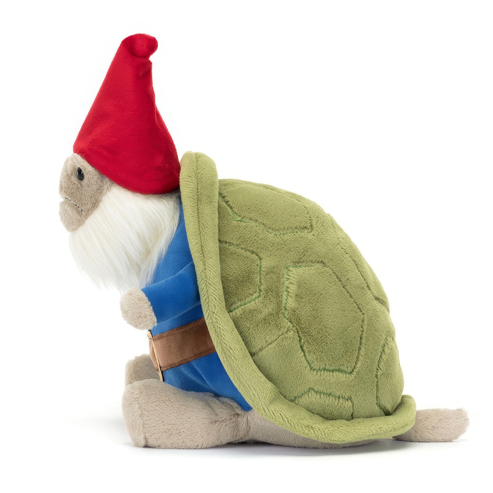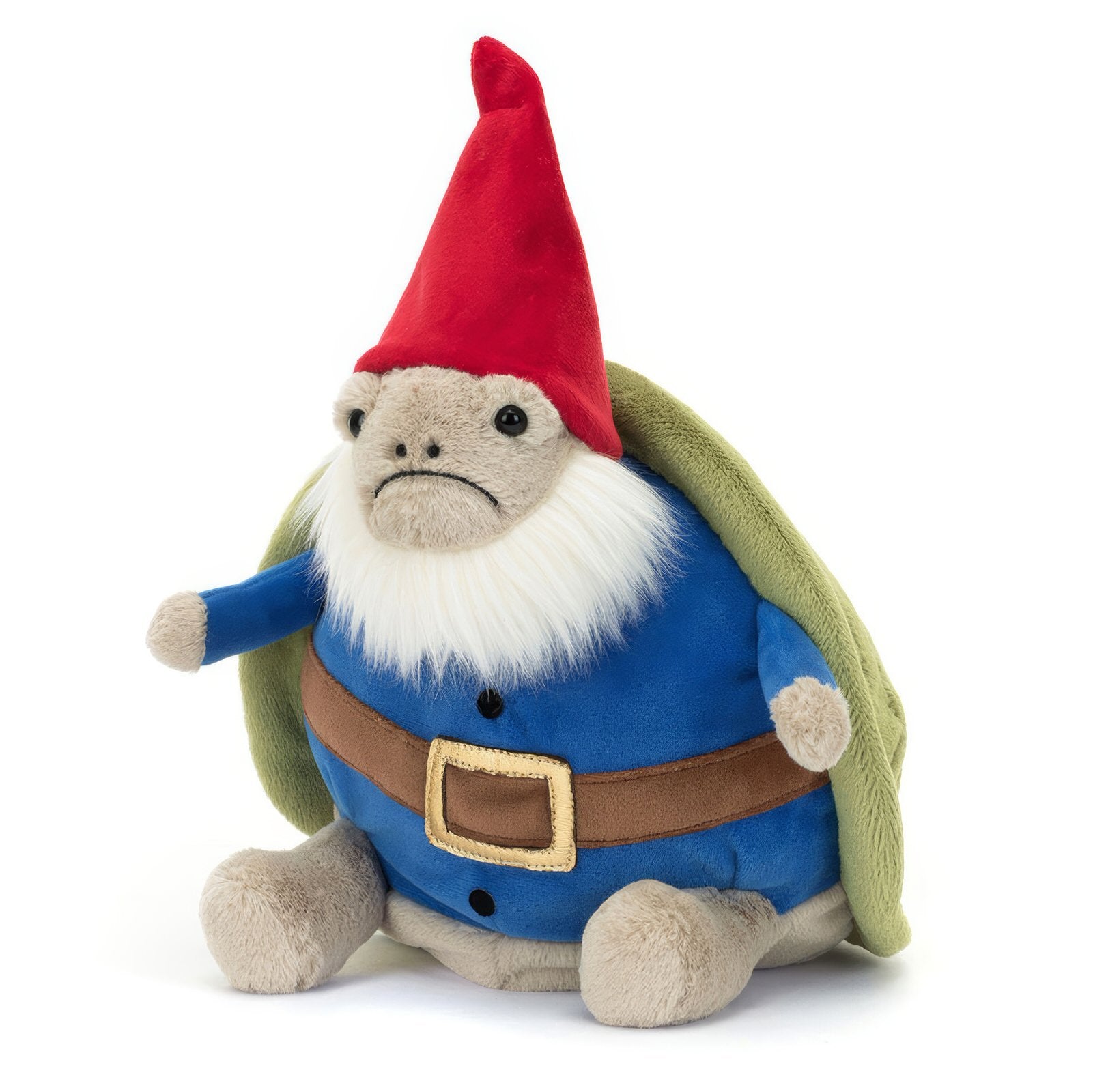 He takes his garden gnome duties very seriously — and it shows! Dressed in a navy tunic and tiny brown belt, he watches the world from beneath his green shell. With a pointy red hat and soft cream beard, he may be the grumpiest gnome around… but also the cutest