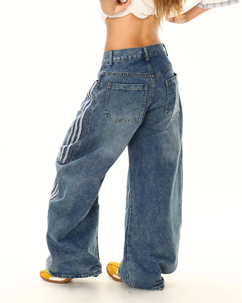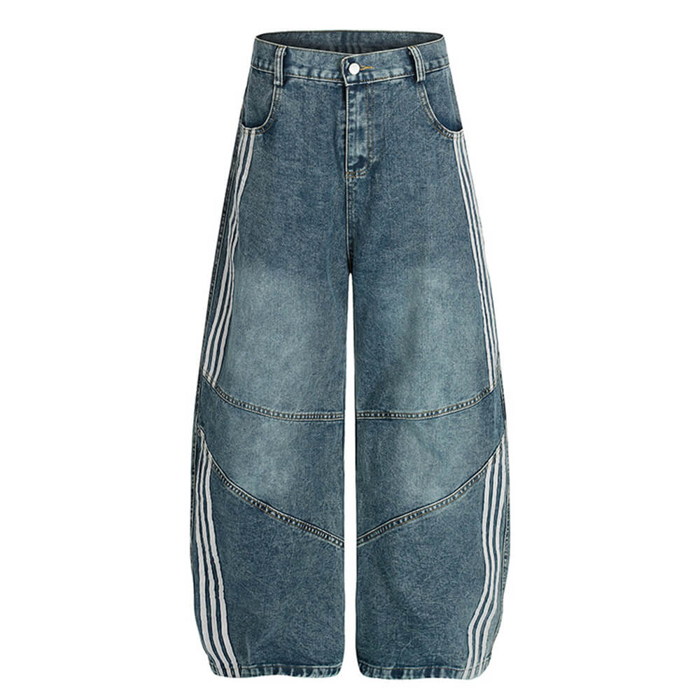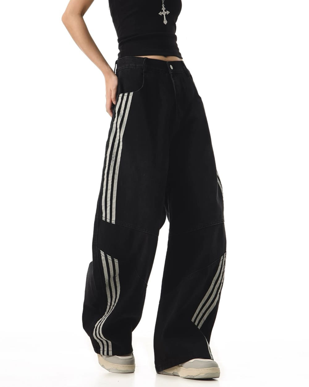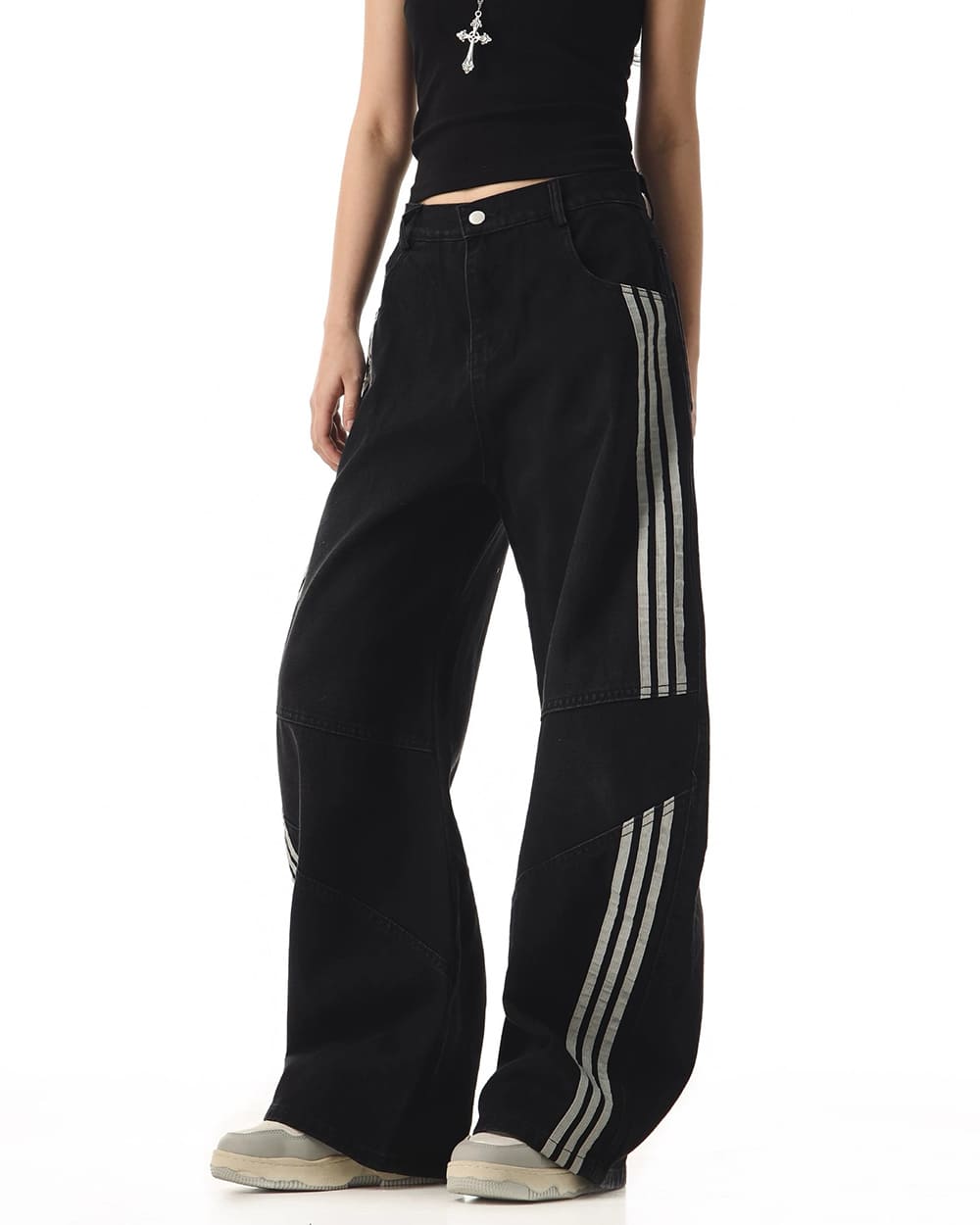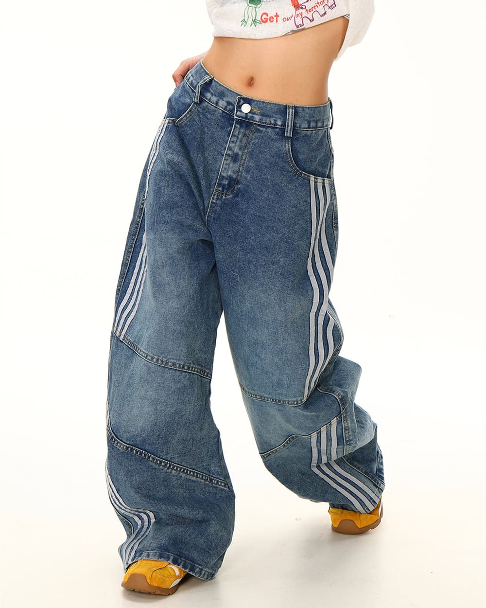 This jeans featuring baggy wide leg fit with contrast side stripe panels. Made from structured denim with visible panel stitching and high waist closure. Classic front and back pockets. Available in blue and black colors with bold stripe detail