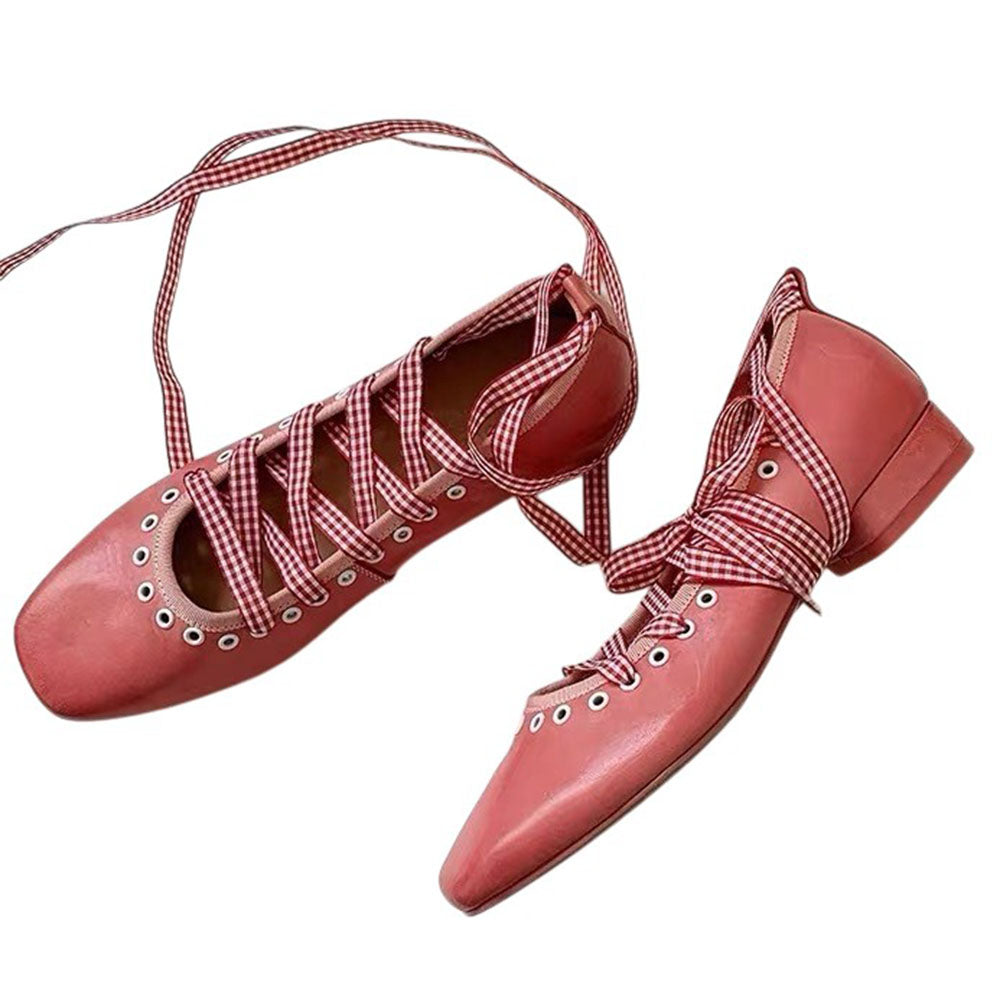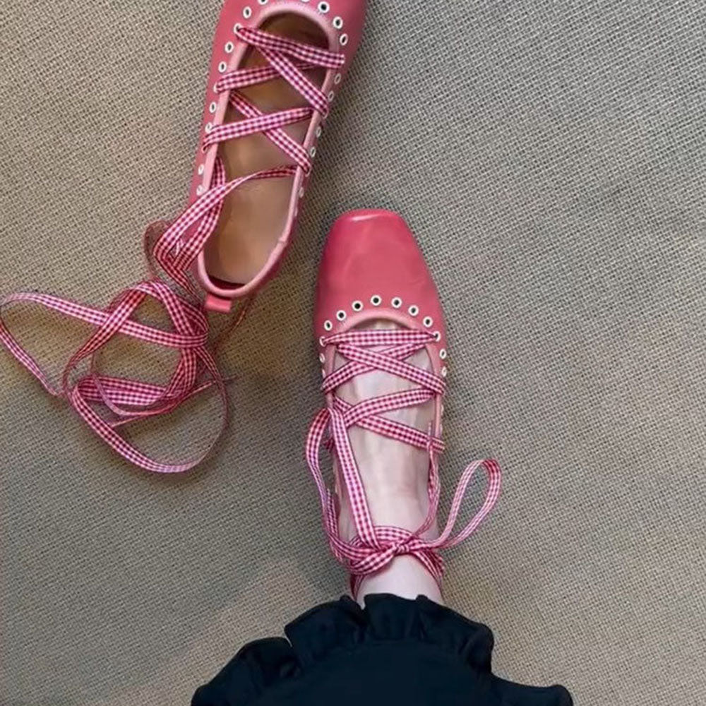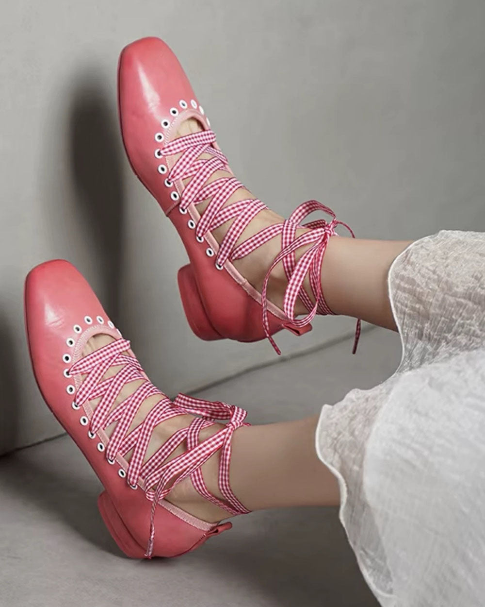 This aesthetic cottagecore flats featuring gingham lace up detailing with soft square toe shape. Designed with low heel, smooth leather-like base, and tie front closure, in pink color with subtle check pattern