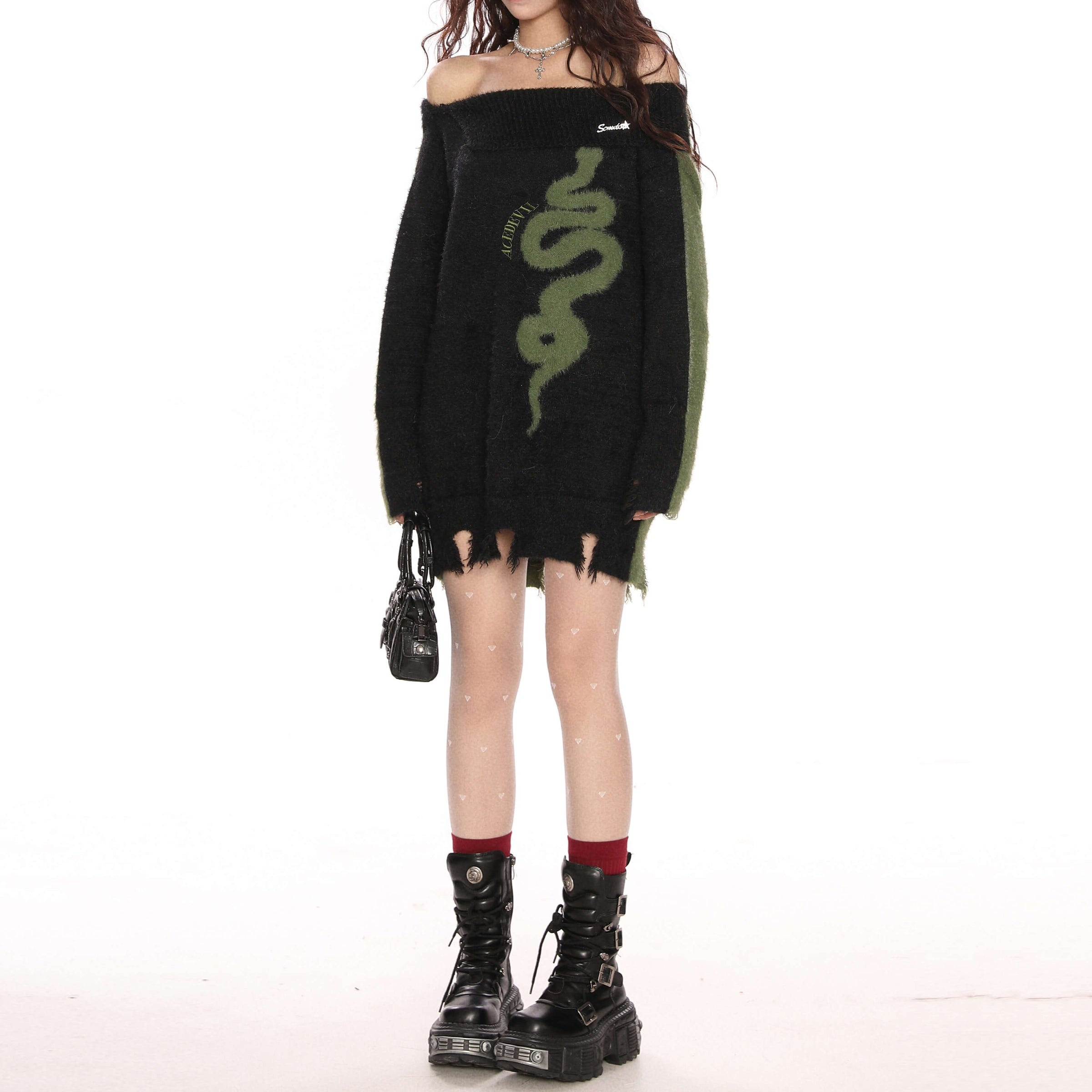 This aesthetic snake knit sweater featuring an off-shoulder neckline, oversized fit, and ribbed cuffs. The bold red serpent design winds across the front, bringing Y2K edge to the cozy knit