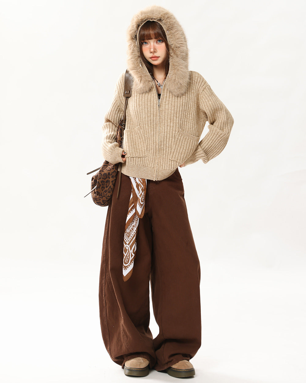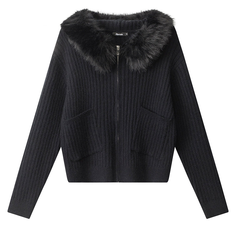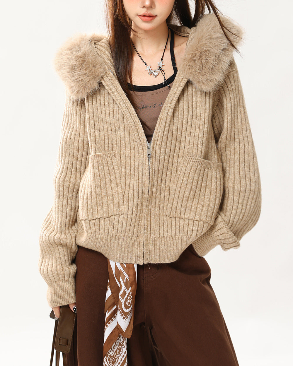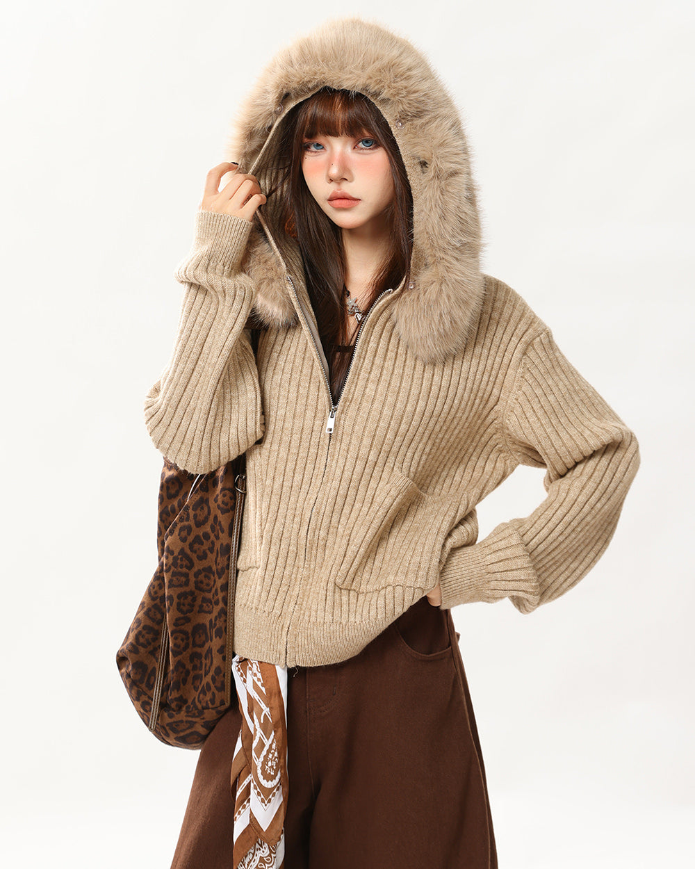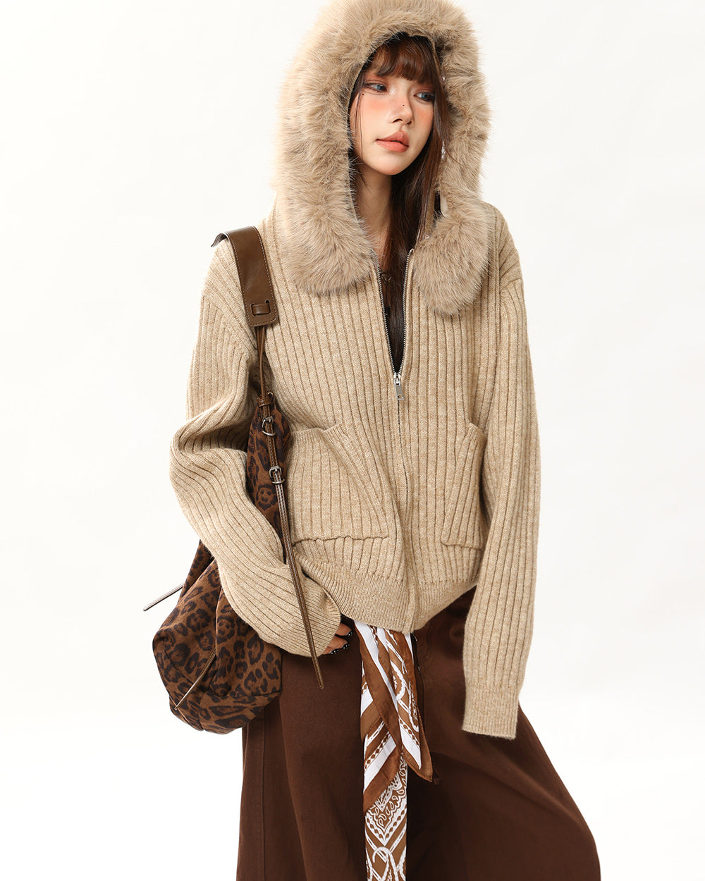 This aesthetic jacket featuring dense rib knitting and a wide faux-fur hood available in beige and black. The zip front extends to the neckline, and the sleeves follow a relaxed cut