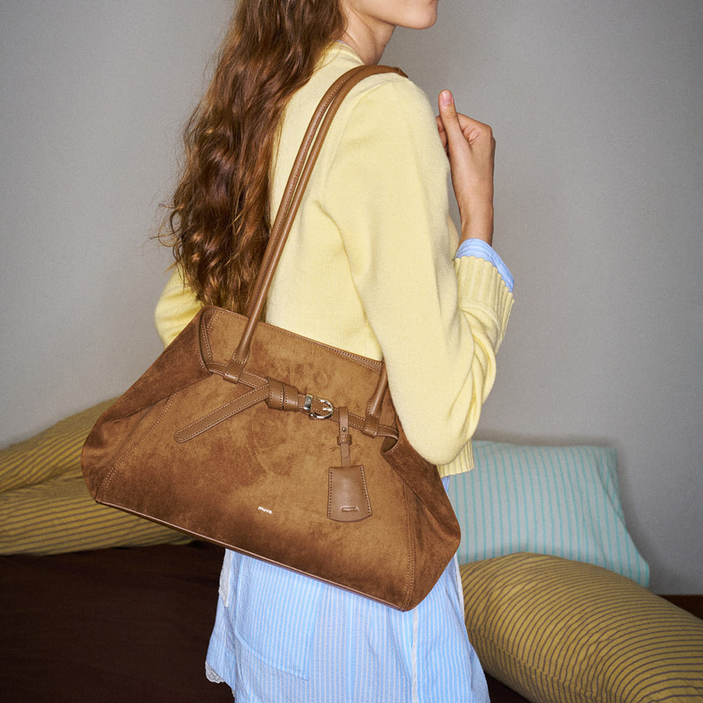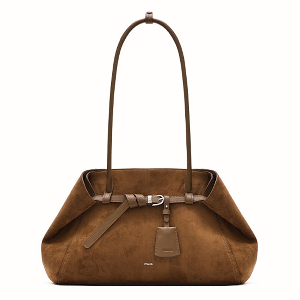 This aesthetic New York style shoulder bag featuring a structured yet soft body with folded side panels and long shoulder straps