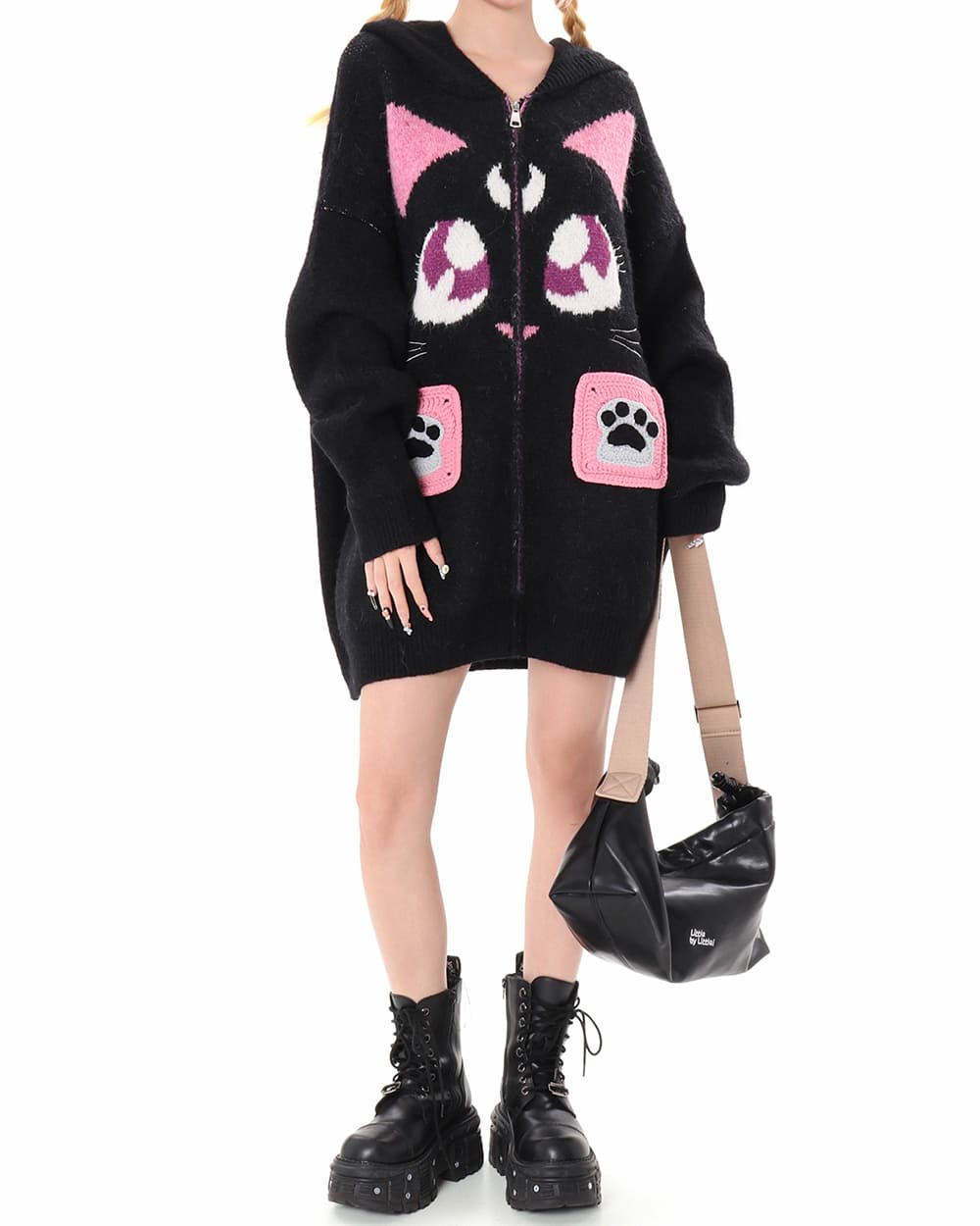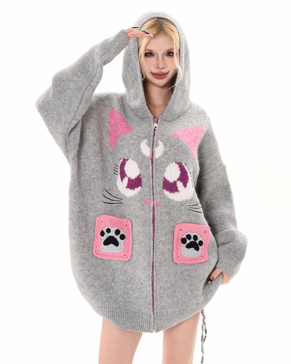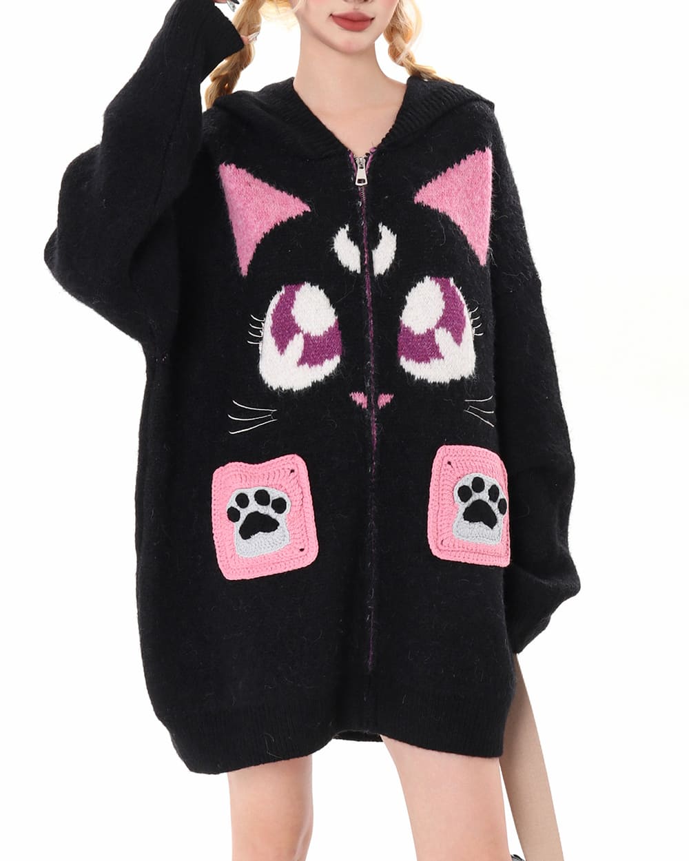 This Aesthetic black cat knit hoodie featuring an oversized silhouette and soft textured fabric with a bold cat face graphic. Designed with a zip up front, hood detail, and spacious front pockets with paw accents