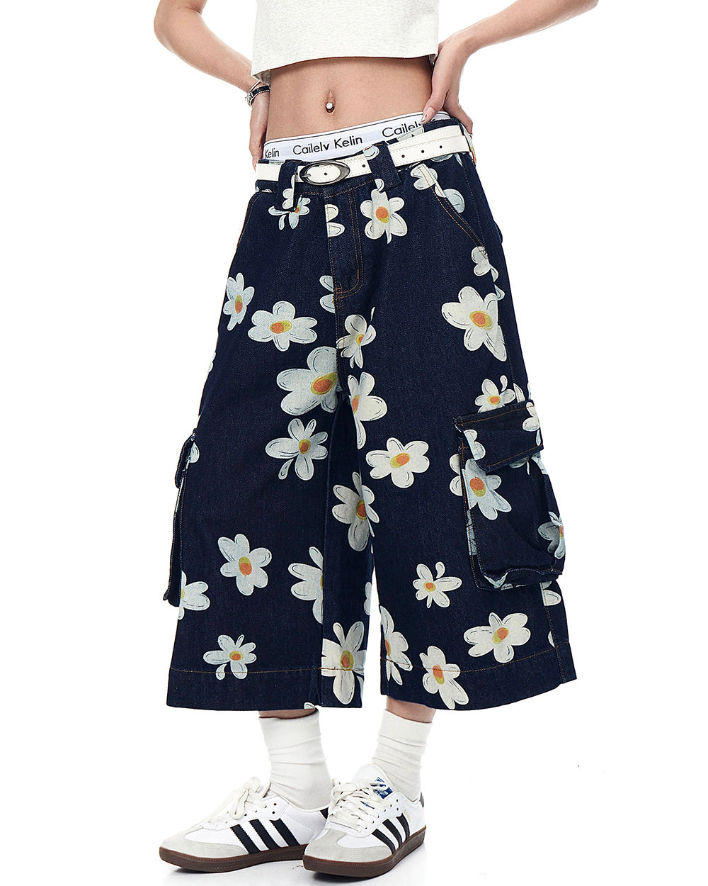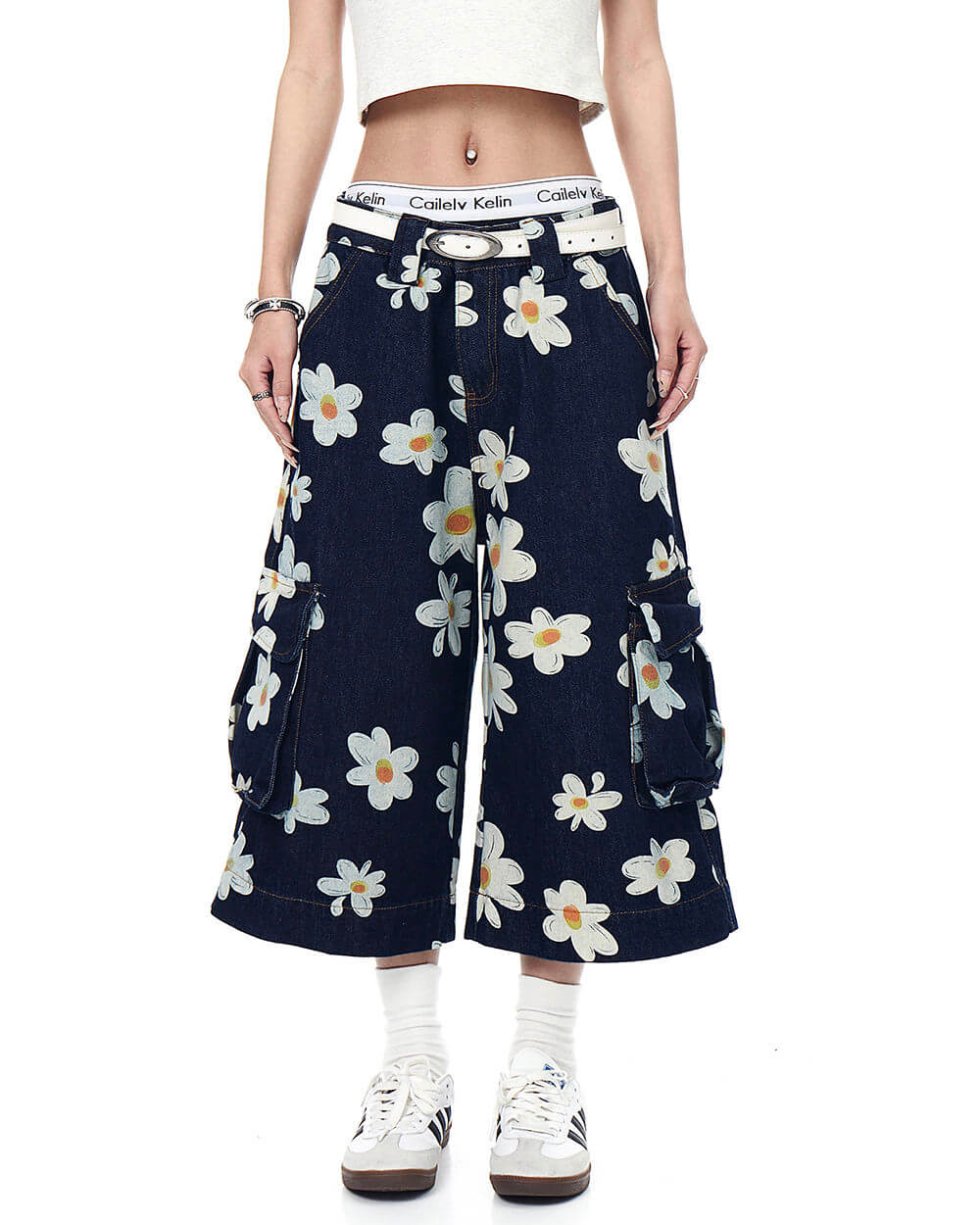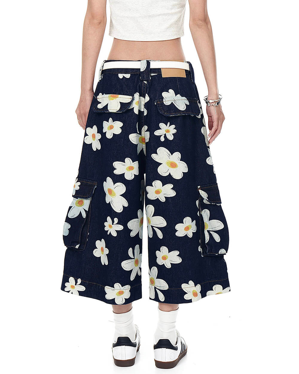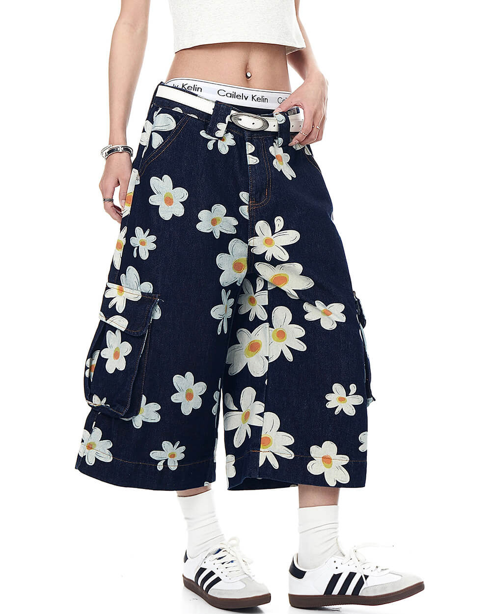 This aesthetic floral shorts featuring all over daisy pattern on deep blue denim with loose wide cut. Made with durable fabric, high rise waist, and functional side cargo pockets for everyday styling