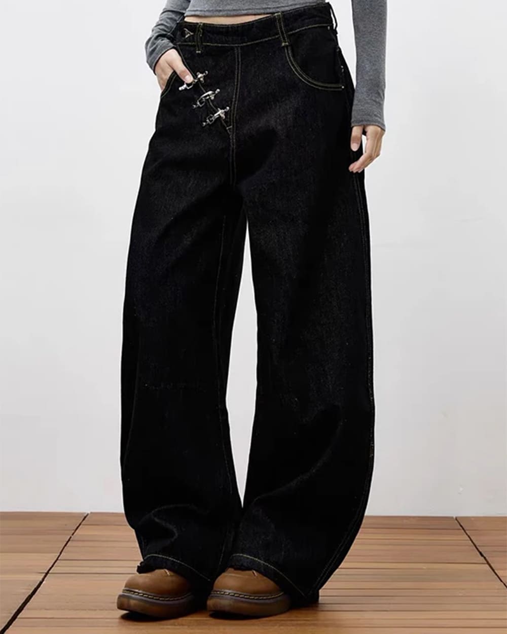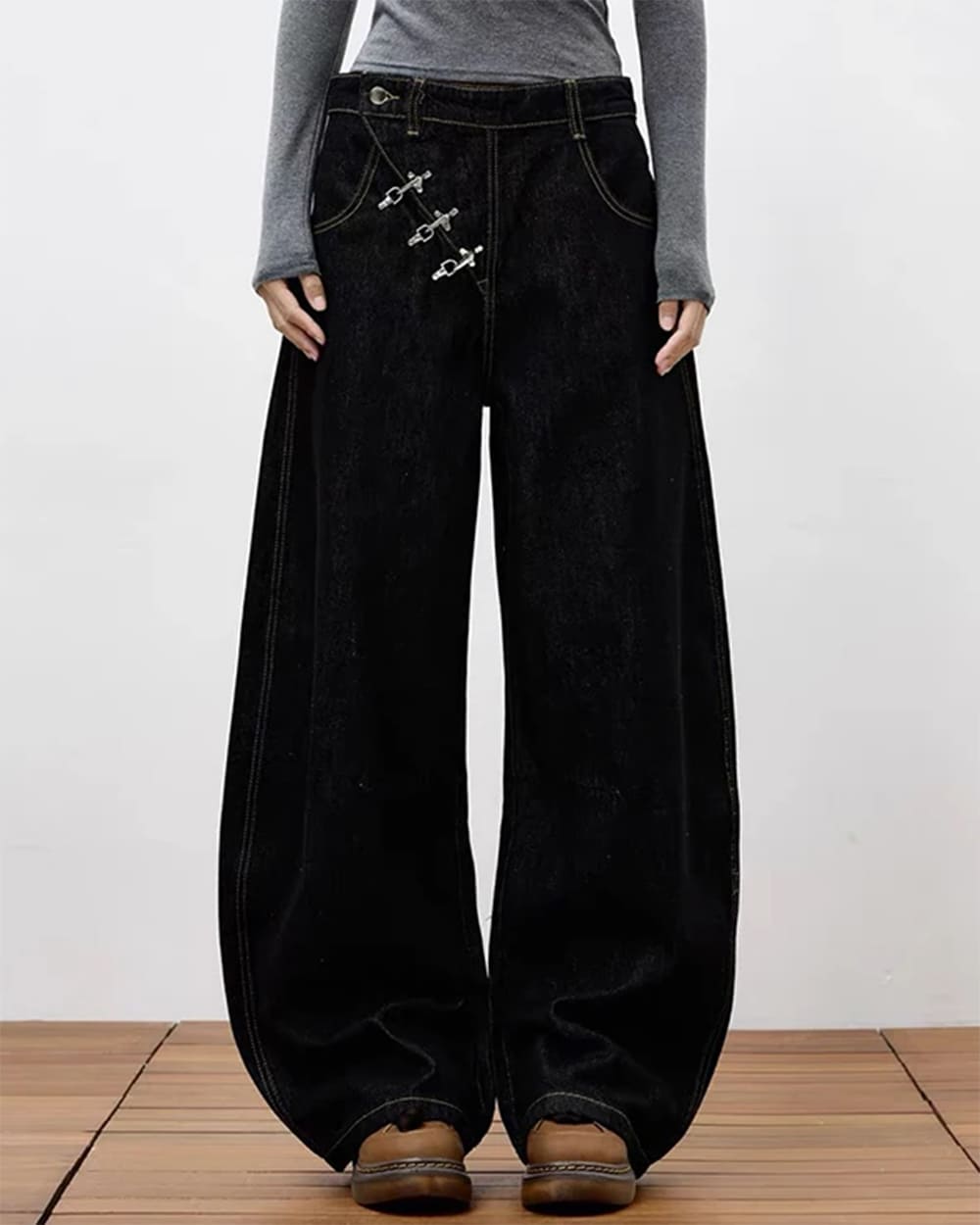 These oversized denim jeans feature a structured wide-leg fit, statement clasp detailing, and edgy silhouette designed for streetwear lovers, grunge aesthetics, and standout casual styling