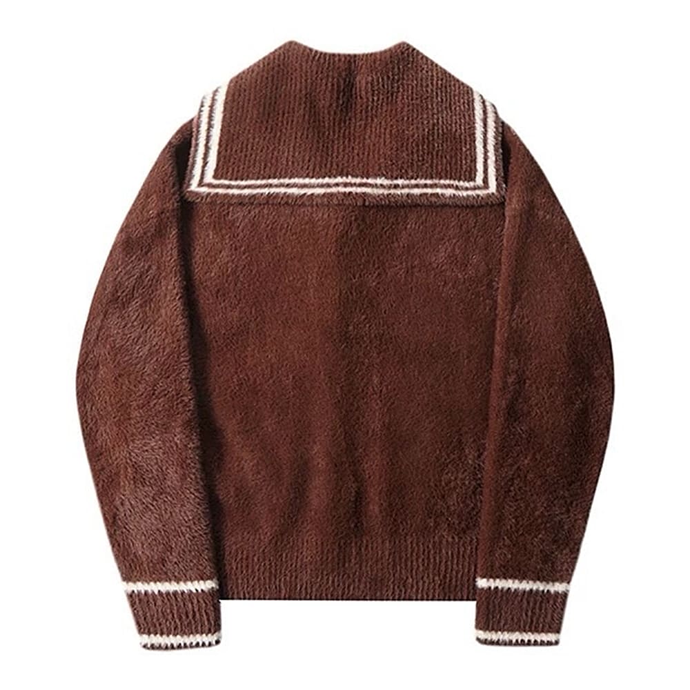 This aesthetic studycore knit featuring a soft fluffy construction in deep coffee brown with white argyle panels. Designed with a sailor-style neckline, front buttons, and two large patch pockets, it blends academic charm with plush comfort for layering