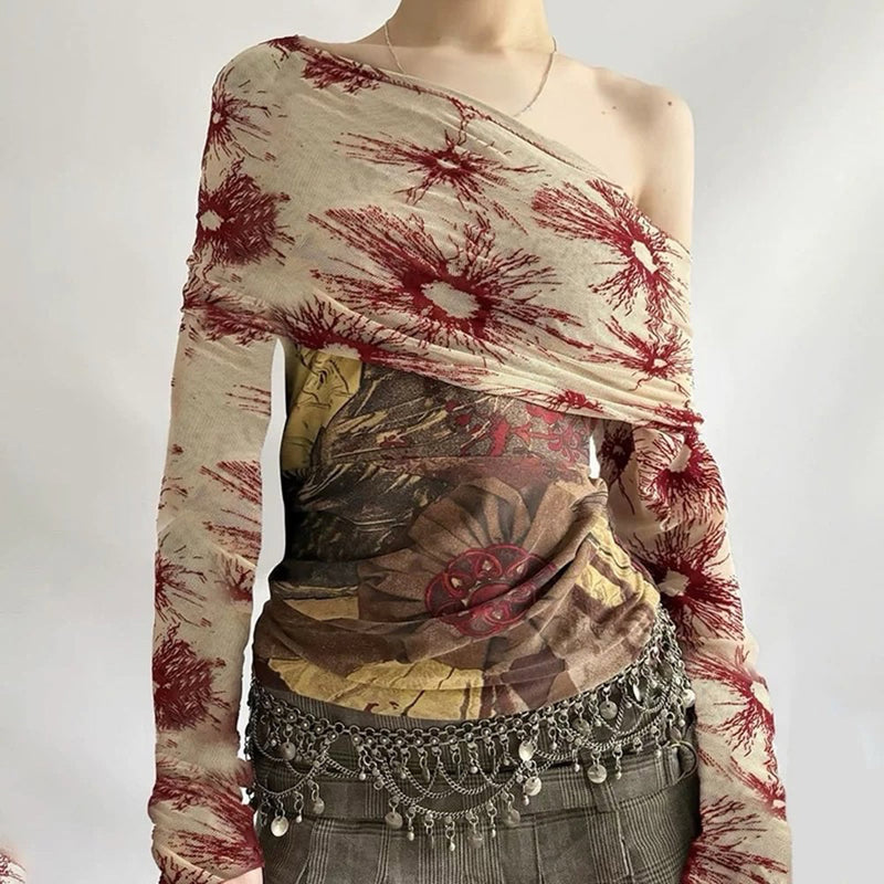 This celestial aesthetic off-shoulder top featuring a sheer mesh fabric with sunburst print across the chest and sleeves. Slim fit with extended sleeves, raw hem, and contrast panel design for a sculpted silhouette