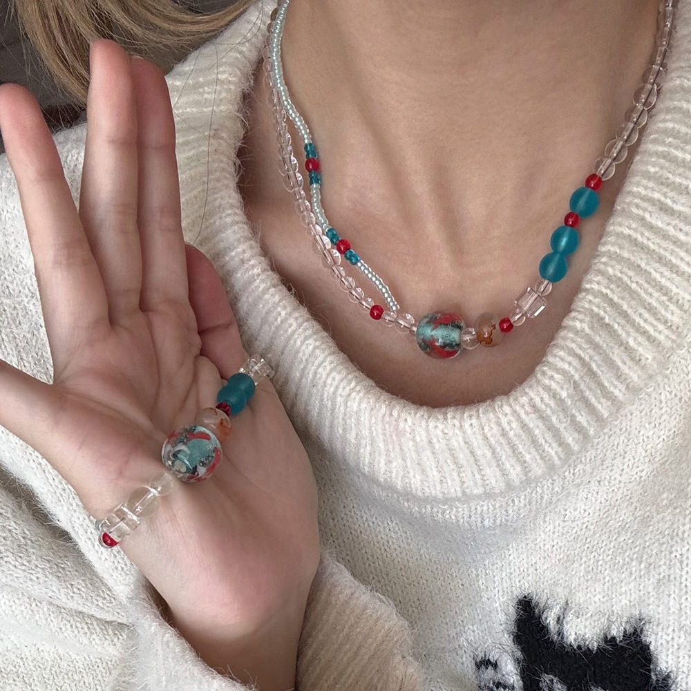 This aesthetic bracelet features clear and blue glass beads with embedded goldfish designs, strung on an elastic cord for a seamless fit