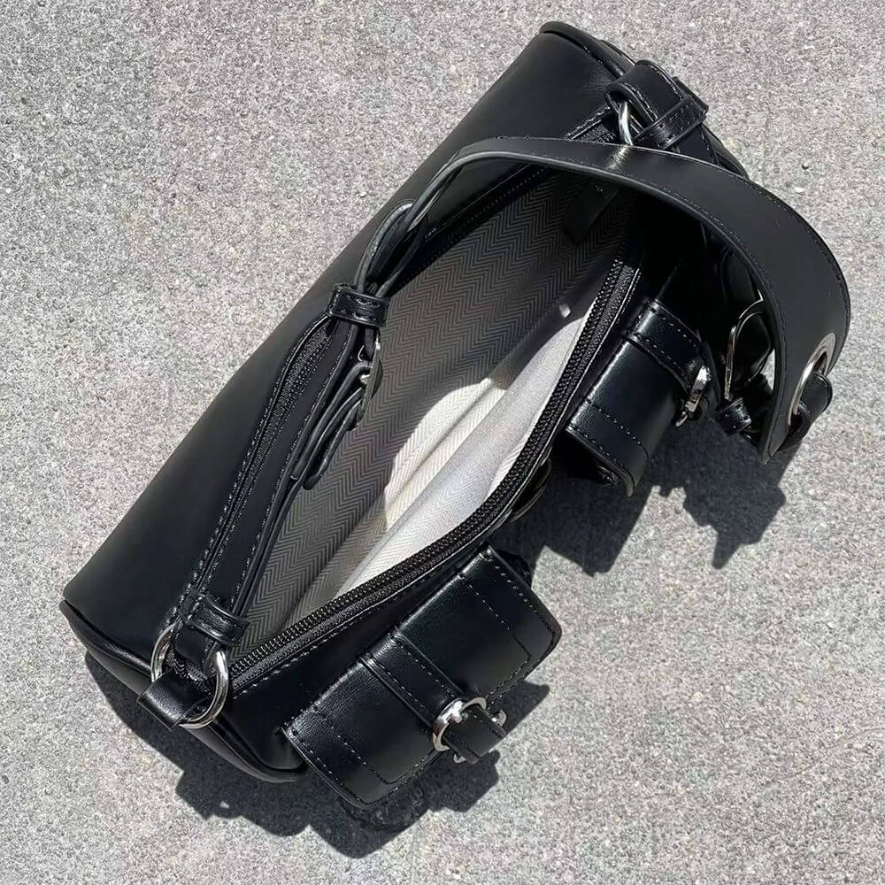 This black underarm bag features a grunge-inspired design with lace-up detailing, dual buckle pockets, and a wide adjustable strap