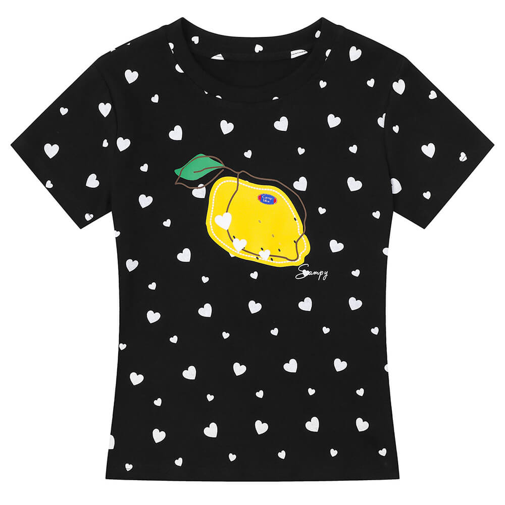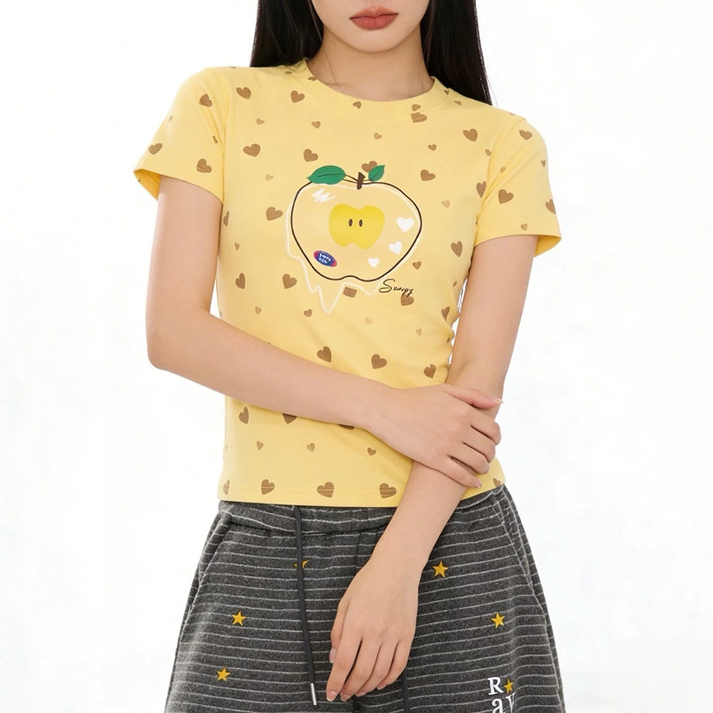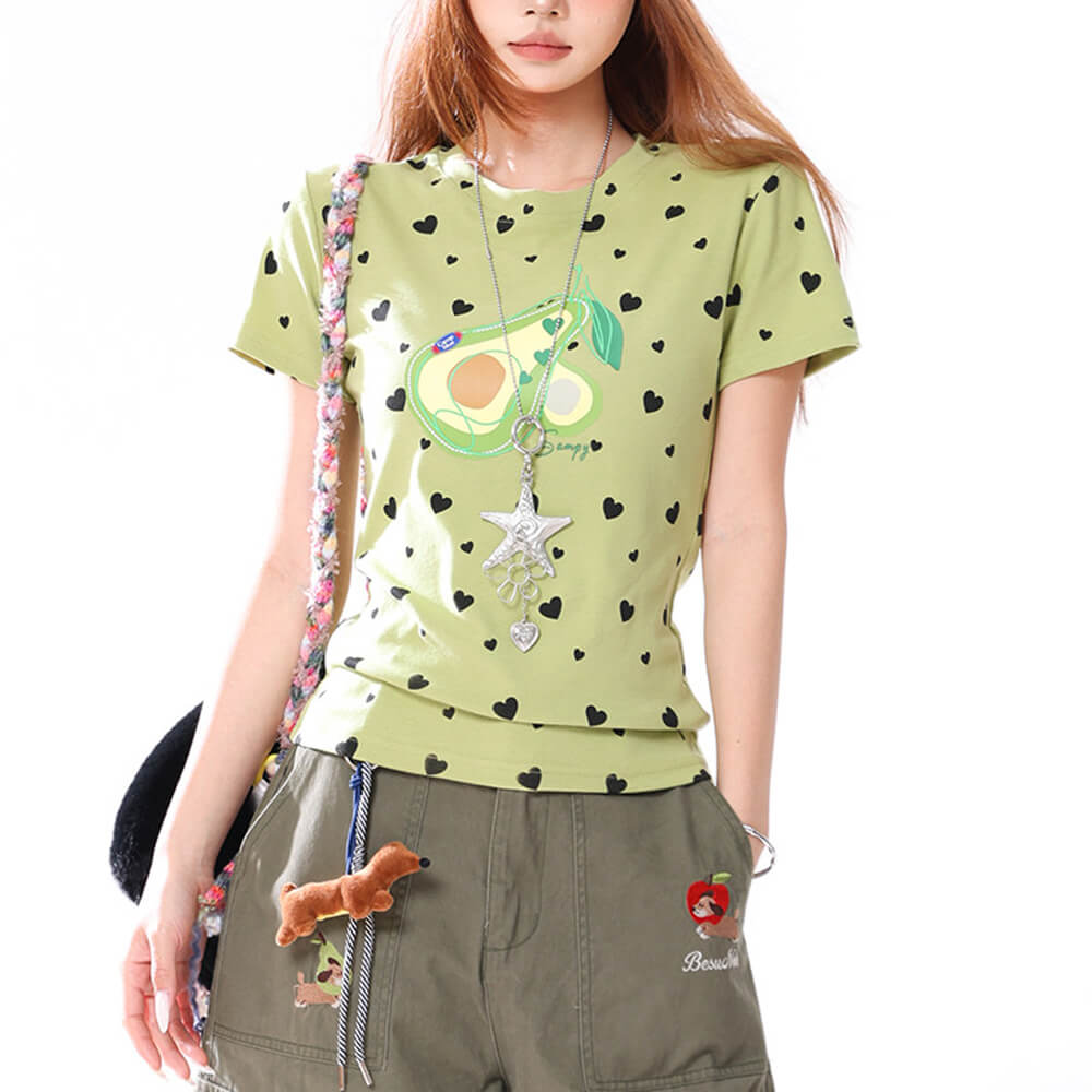 This aesthetic t-shirt featuring heart pattern with fruit graphic detail including lemon, avocado and apple variations