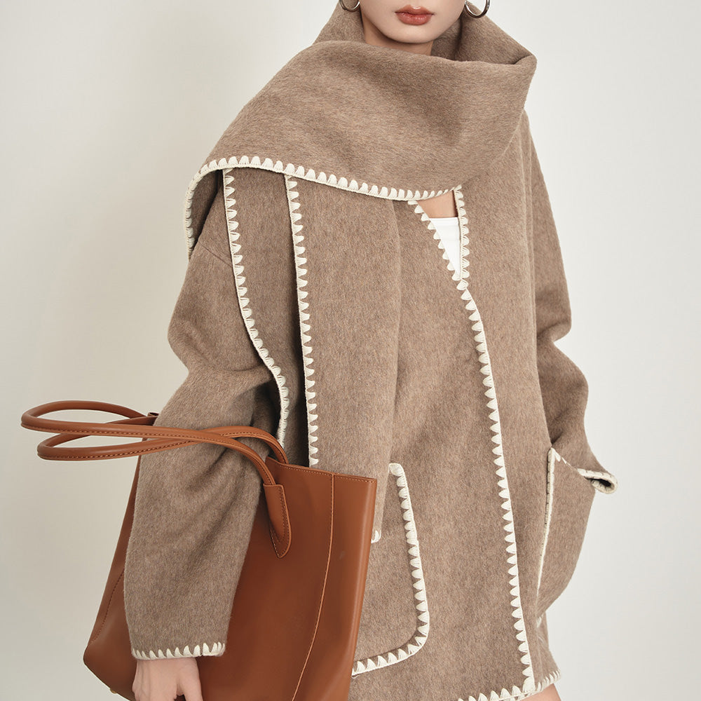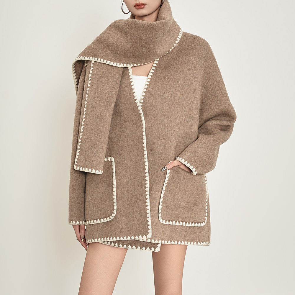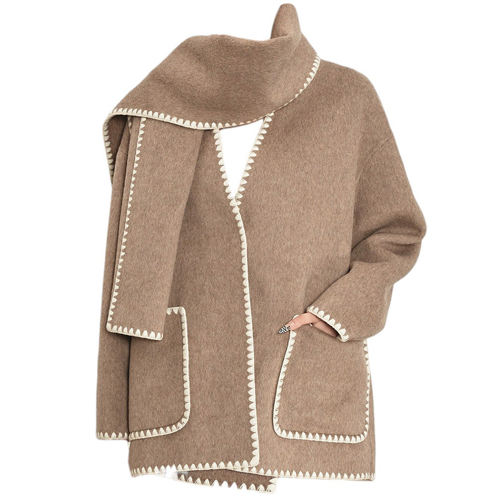 This aesthetic camel knit mini skirt and coat set features a chic oversized fit, cozy scarf detail, contrast white trim, and versatile design, making it perfect for stylish fall and winter layering