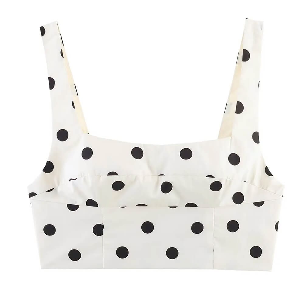 This aesthetic dot crop top featuring corset-inspired design, seam detailing, and supportive wide straps. Made from smooth fabric with black polka dot pattern and clean structured shape