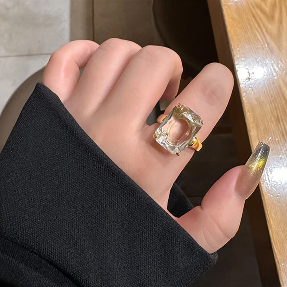 This aesthetic ring features a large clear crystal stone with intricate gold detailing and an open adjustable band