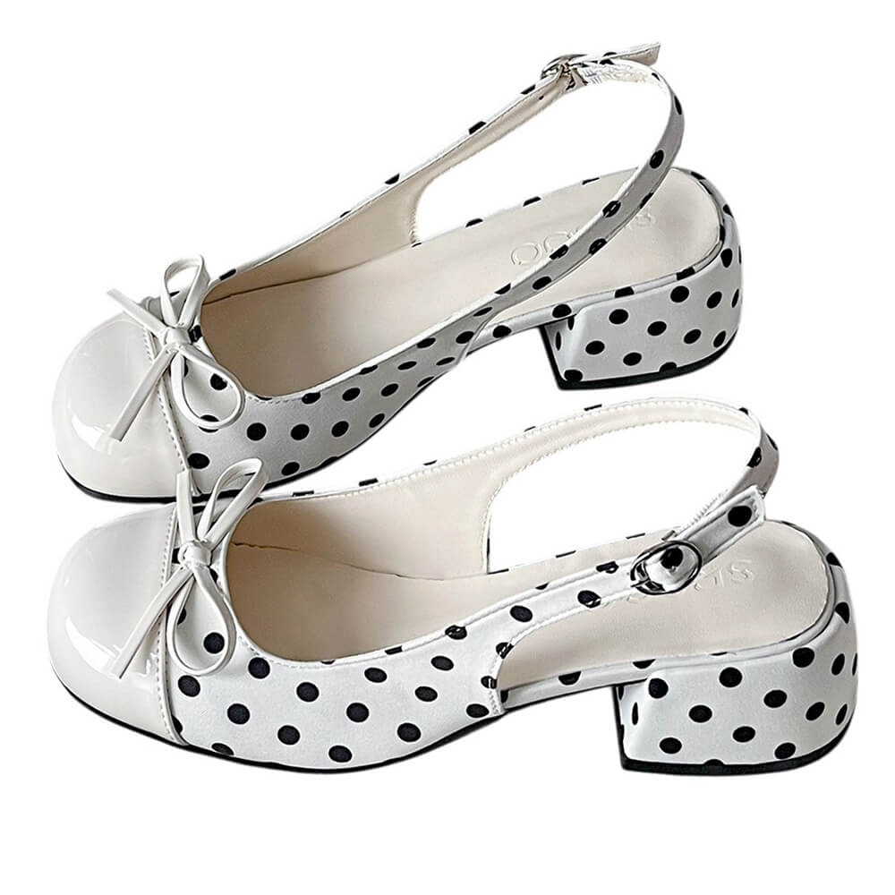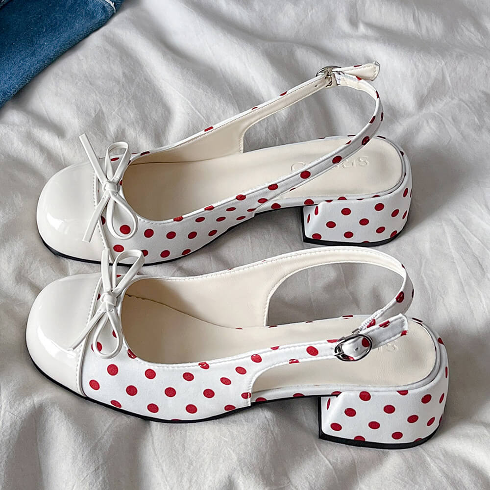 This aesthetic polka dot mary jane heels featuring black and white dot print with a small bow on the front. The slingback strap fastens with a buckle and sits comfortably on the heel, while the rounded toe and block heel give a stable and clean shape