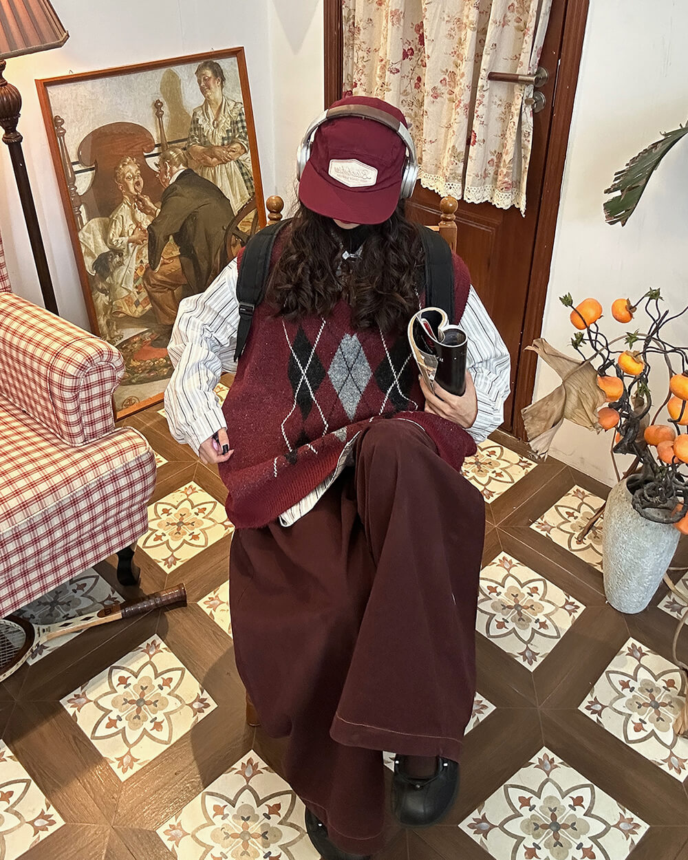 This aesthetic knit vest featuring a burgundy and gray argyle pattern with black accents. The V-neckline, soft knit texture, and relaxed fit give it a nostalgic college feel — perfect for layering over shirts when you’re running late to class