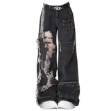 These wide-leg jeans feature a vintage washed denim design with bold red side stripes, creating a unique 90's style look