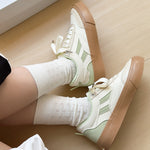 This aesthetic pair of low tops featuring a green apple-shaped heel panel, beige canvas sides, and a gum outsole. The layered construction and contrast textures make the design fresh and fun ✨