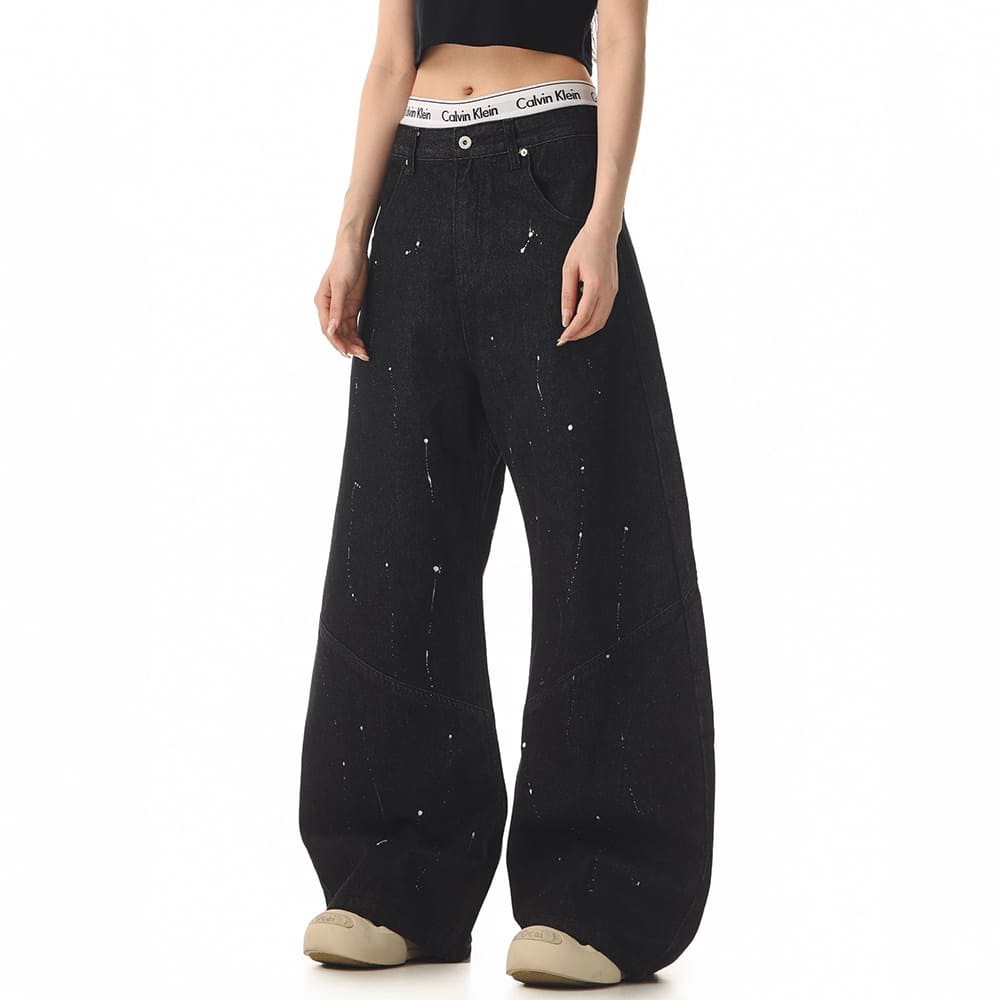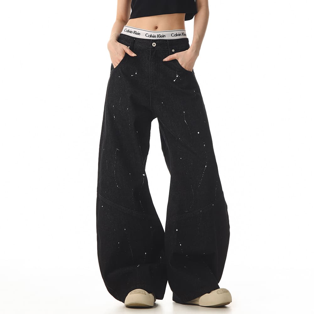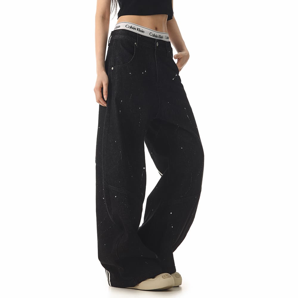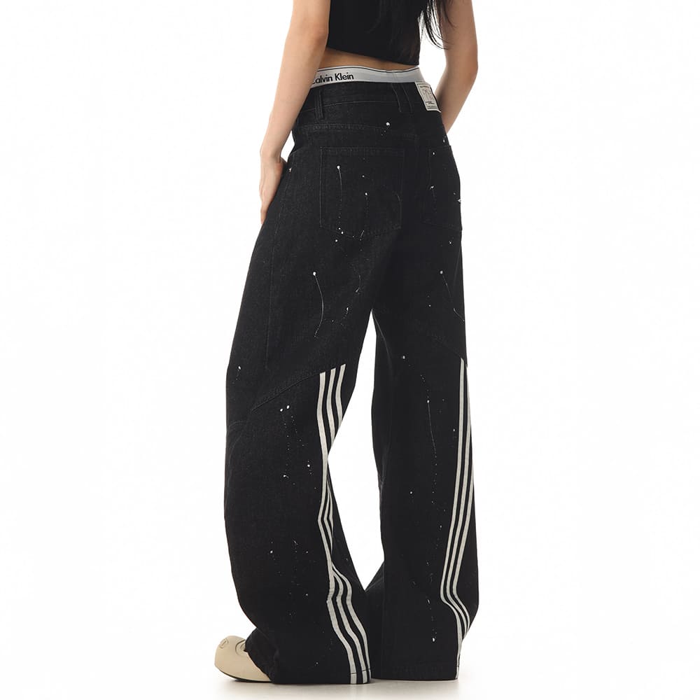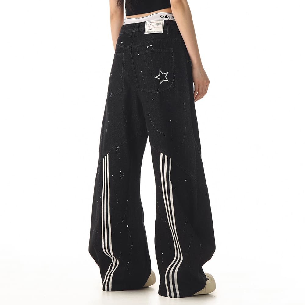 These wide leg jeans featuring a relaxed loose silhouette that moves freely. Includes a mid rise fit, front and back pockets, paint effect details, star patch on the back, and contrast side stripes for that thrown on and go city vibe