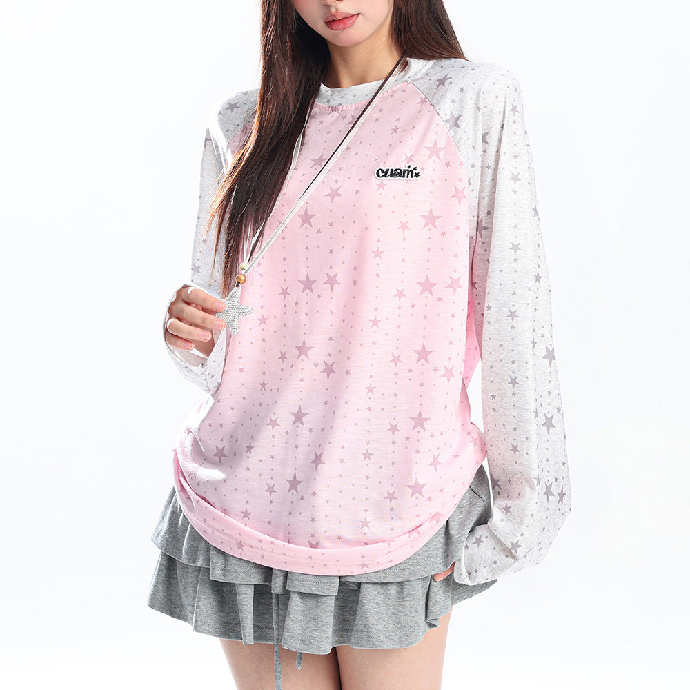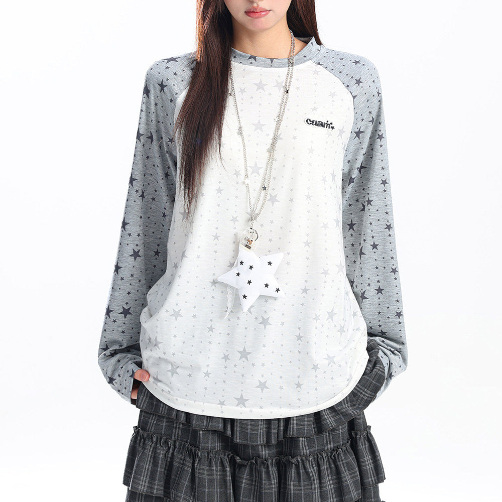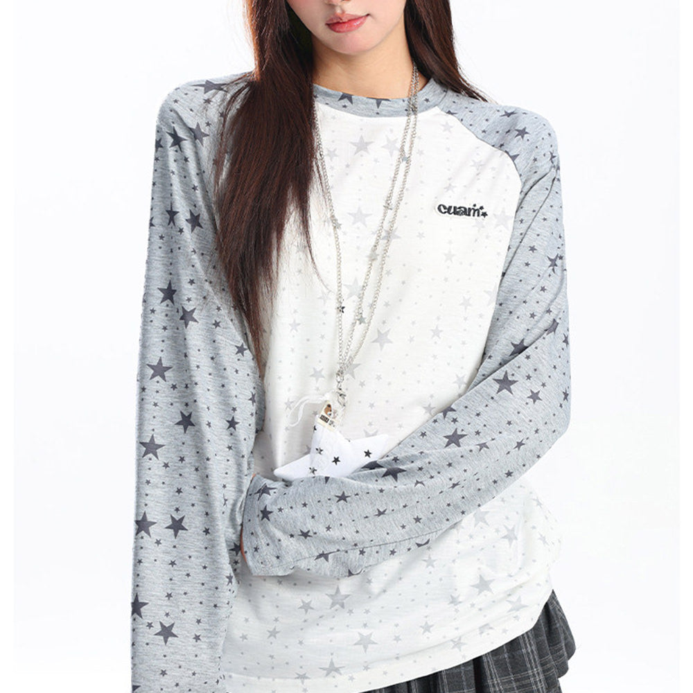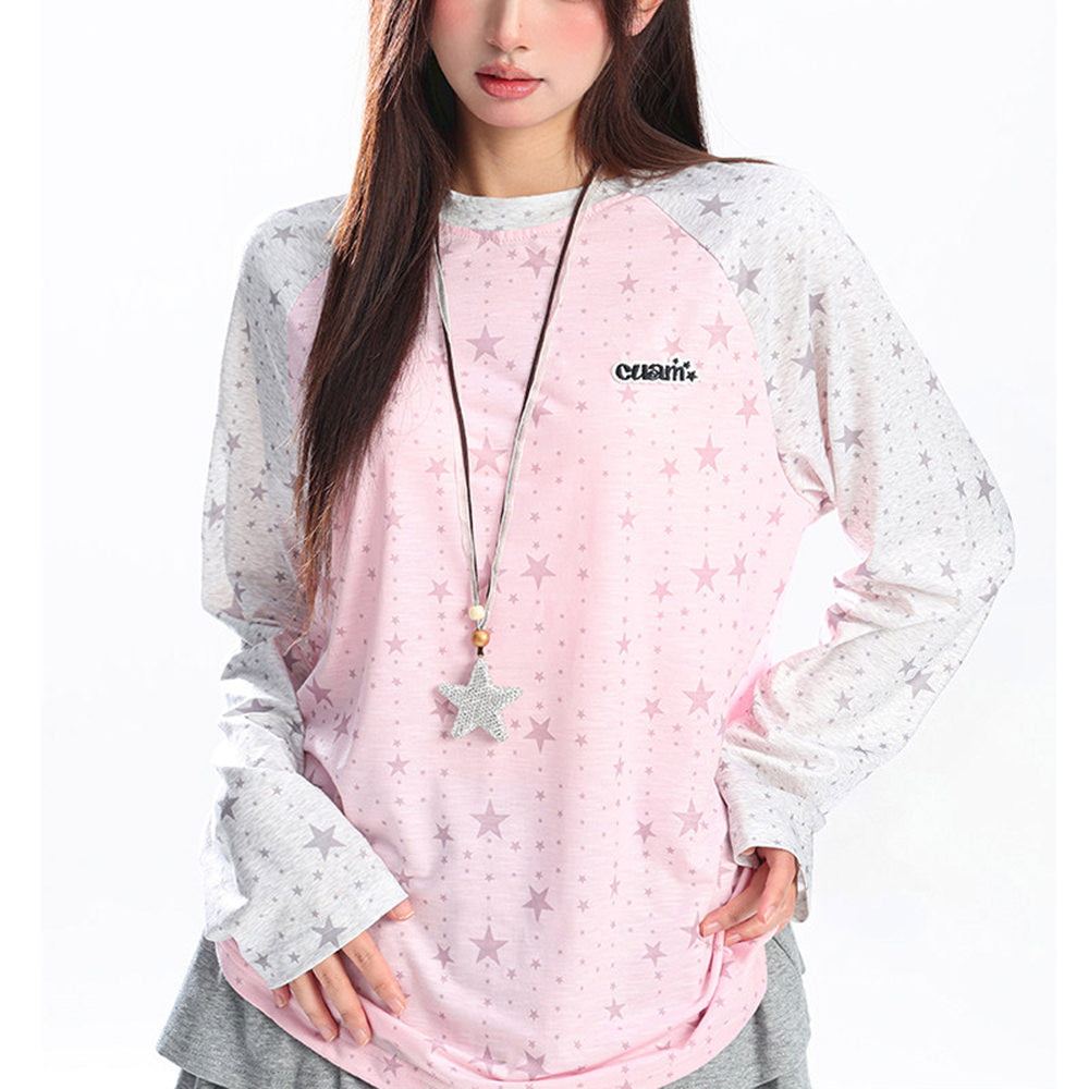 This star pattern long sleeve top featuring a slightly loose silhouette and soft-touch material. Decorated with scattered star prints and contrast sleeves, it has a crew neck, long fitted sleeves and a clean hem, coming in white and grey, blue, and pink variations