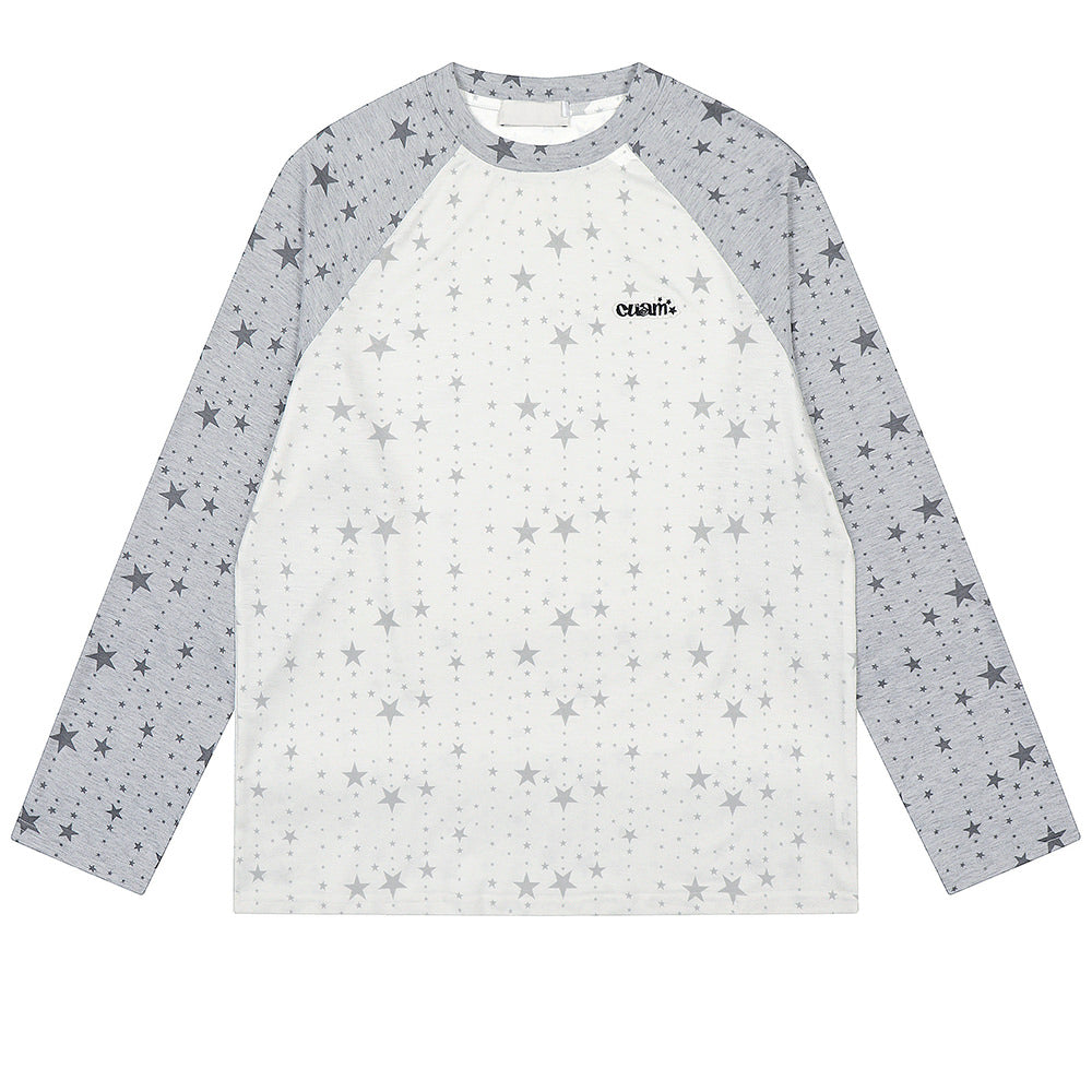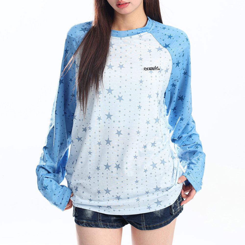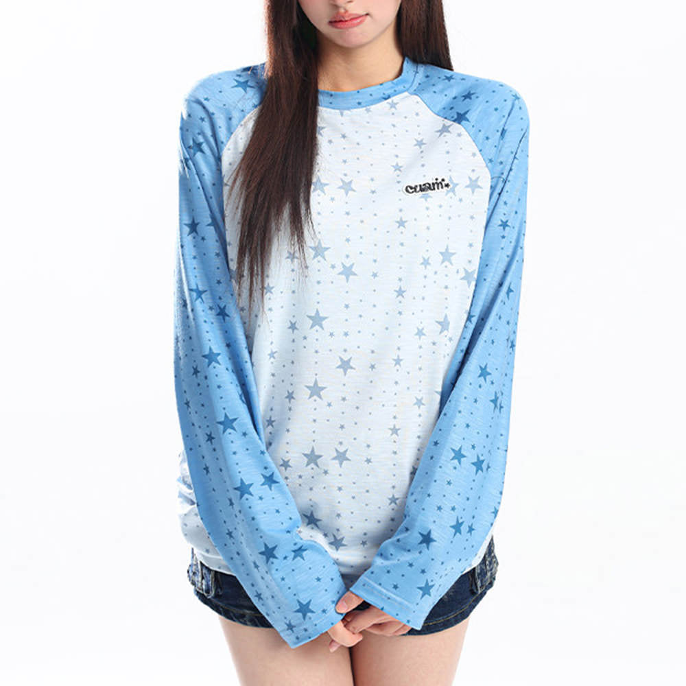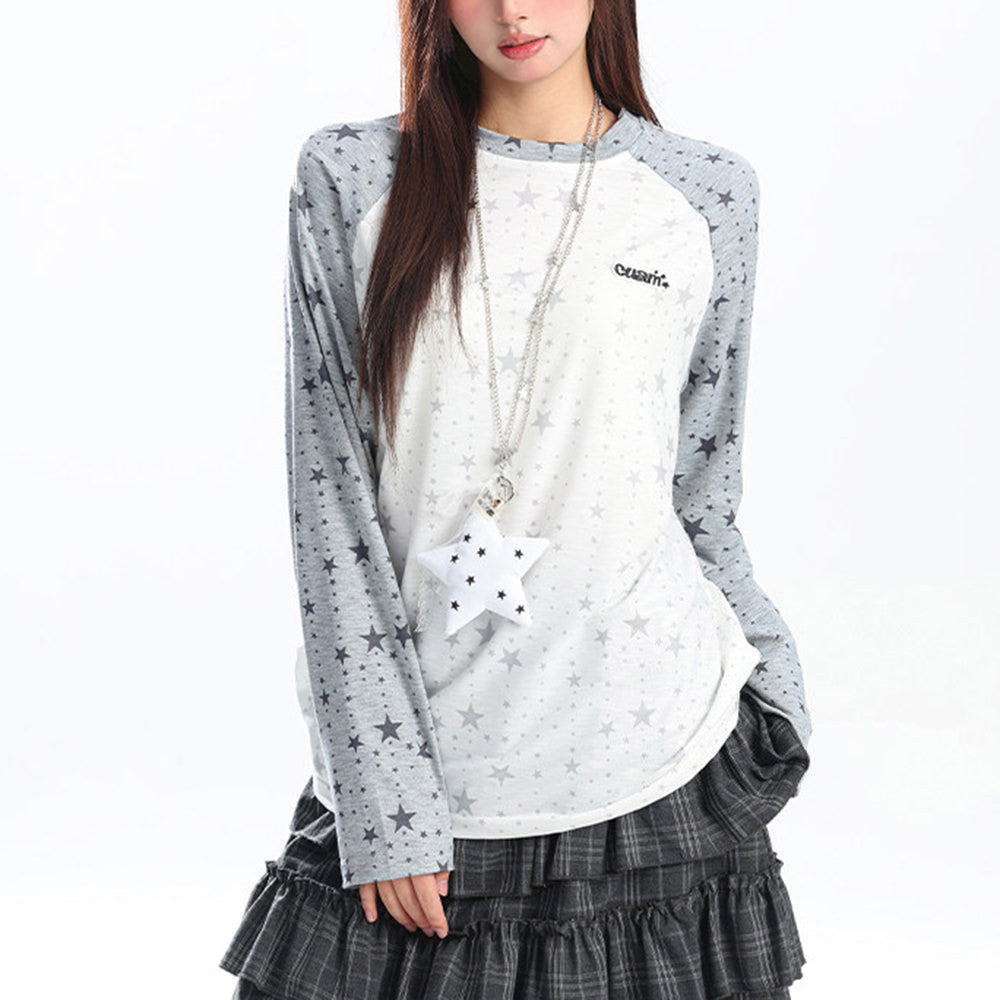 This star pattern long sleeve top featuring a slightly loose silhouette and soft-touch material. Decorated with scattered star prints and contrast sleeves, it has a crew neck, long fitted sleeves and a clean hem, coming in white and grey, blue, and pink variations
