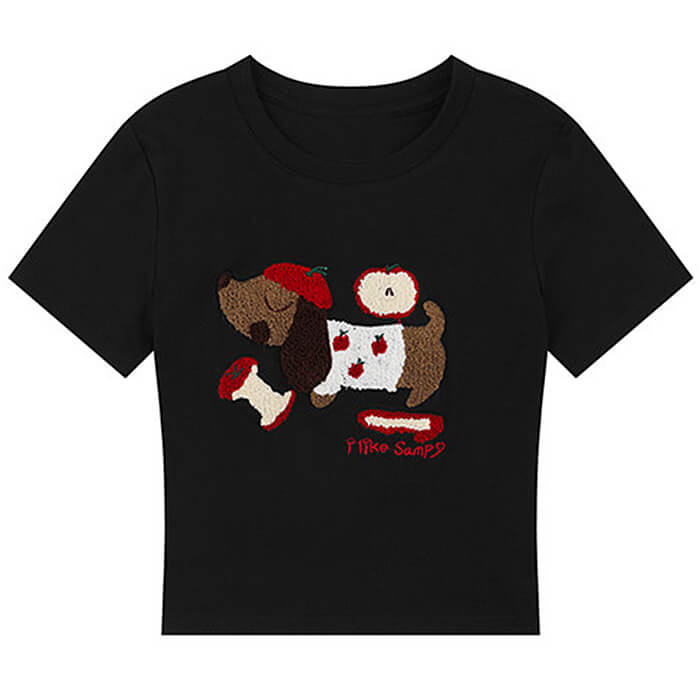 This t-shirt featuring fitted shape with fuzzy textured print of dog and apple graphic on the front. Short sleeves with clean neckline. Available in white, black and grey