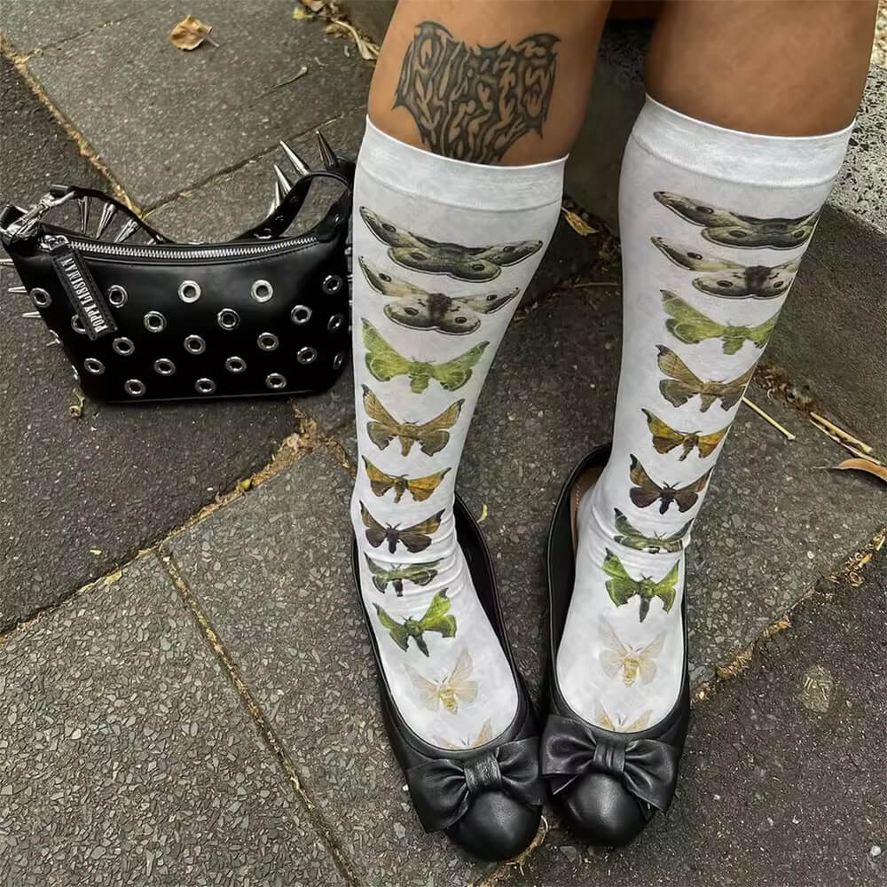 This aesthetic vintage butterfly socks featuring smooth stretch fabric with botanical style butterfly graphics arranged along the legs