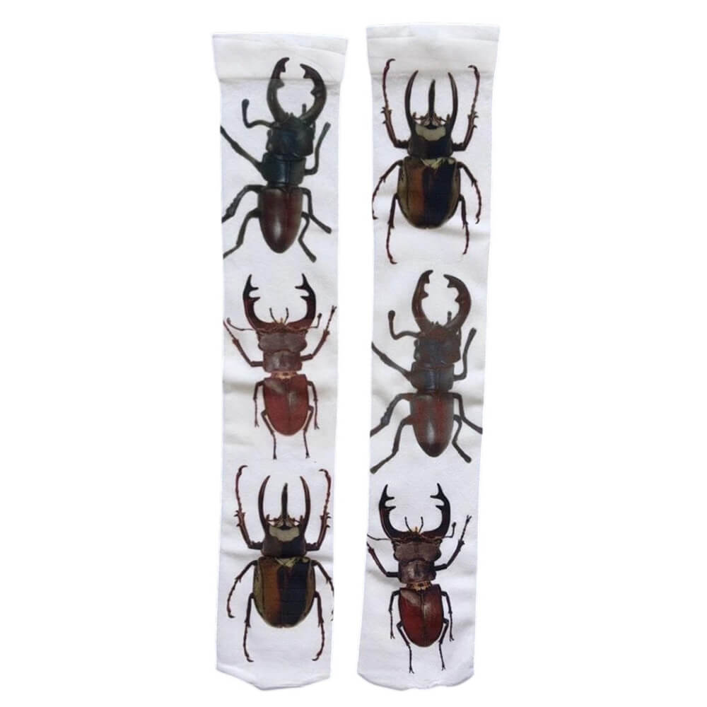 This aesthetic beetle print socks featuring soft stretch fabric decorated with large beetle illustrations arranged vertically along the legs