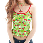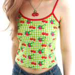 This aesthetic baby tee featuring green gingham with all-over cherry and apple print, red piping, and skinny straps. Stretchy, cropped, and form-fitting — this top feels like summer in cartoon colors
