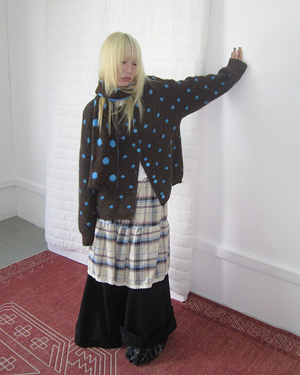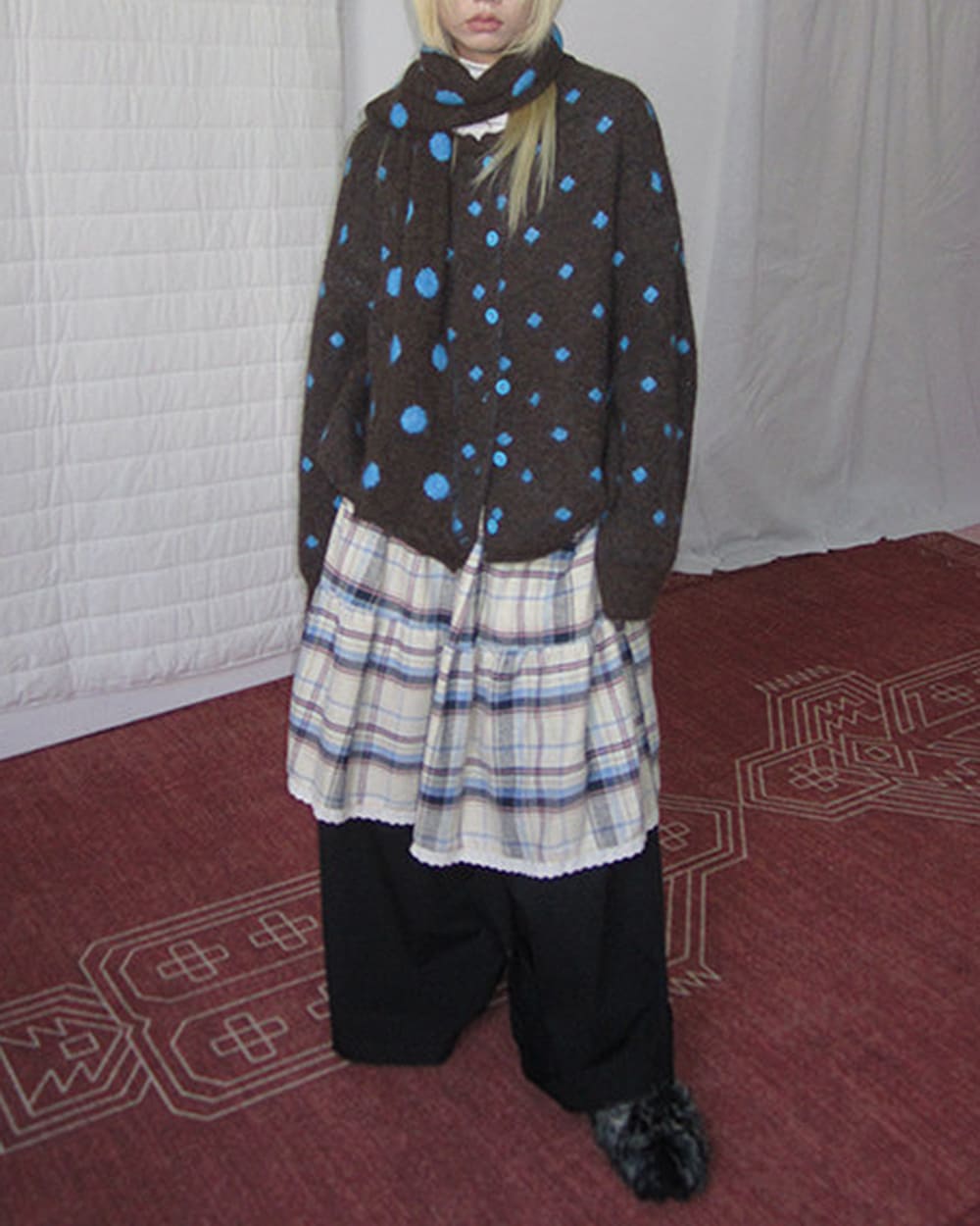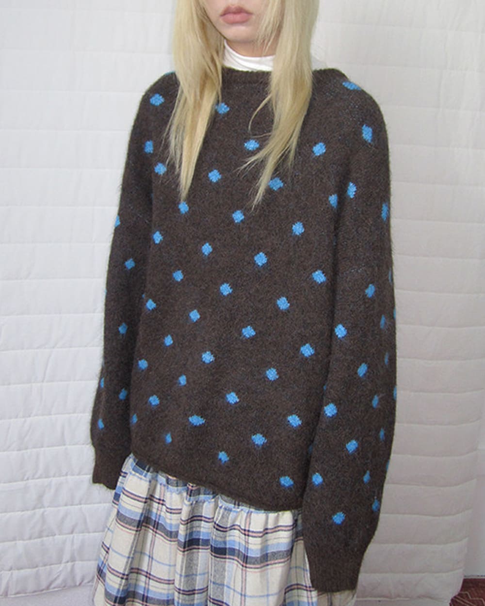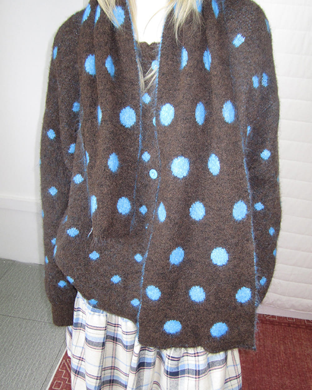 This aesthetic polka dot cardigan featuring warm coffee brown tones with bright blue polka dots across a soft knit base. Designed with a button front closure, relaxed oversized fit and dropped shoulders, creating a cozy layered silhouette with an indie feel