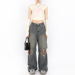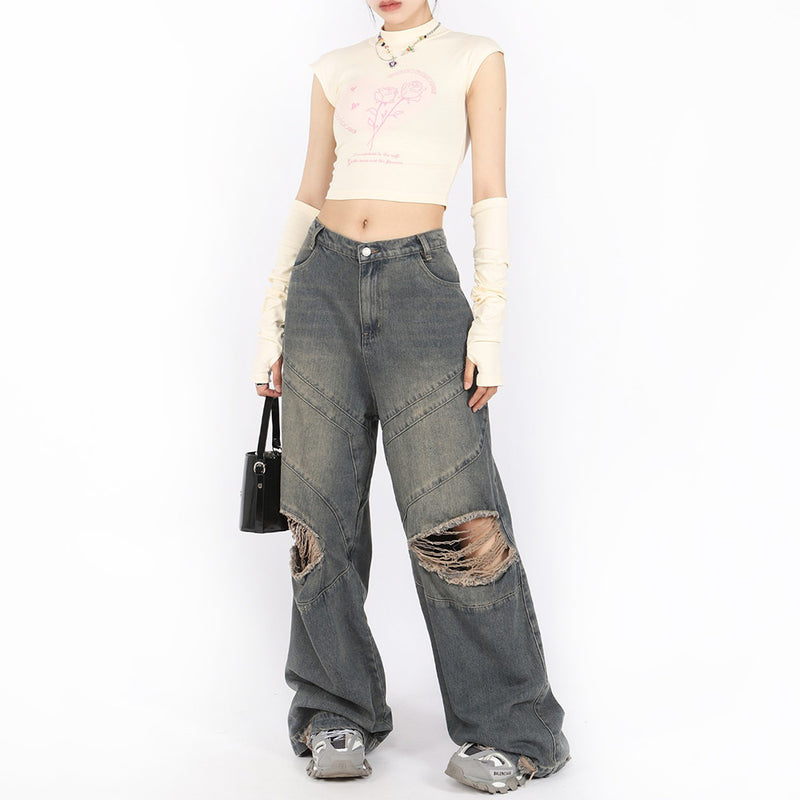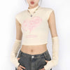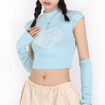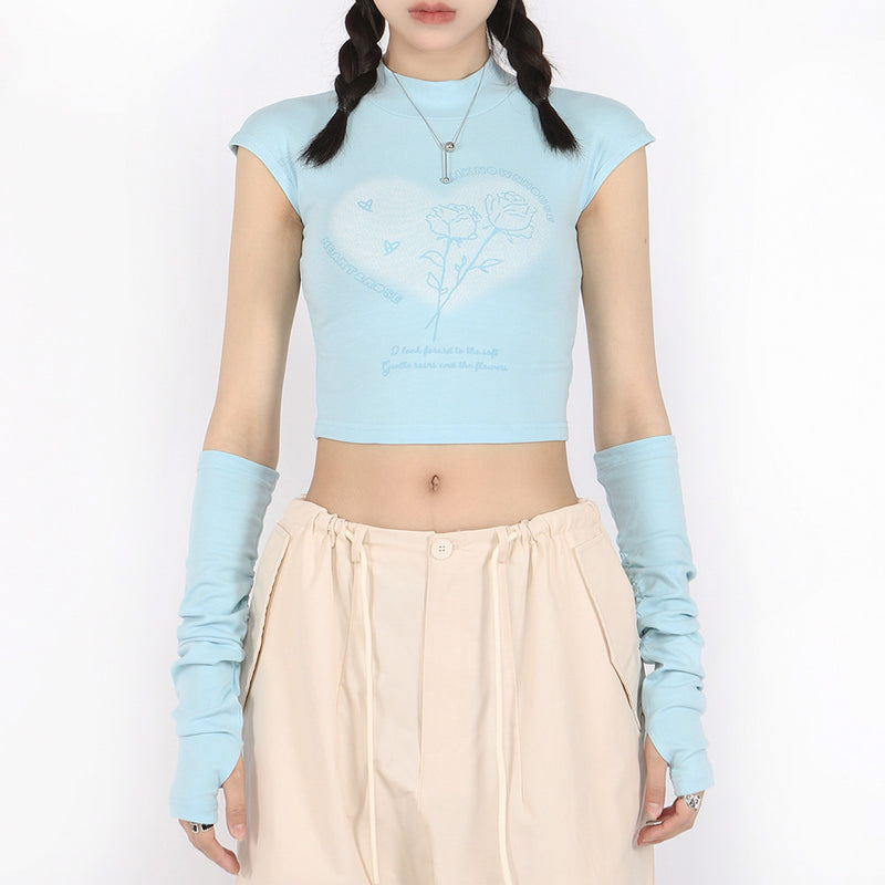 This soft girl aesthetic top featuring pastel stretch fabric, a high crew neckline, and cropped fit with delicate floral print. Comes with matching detached arm sleeves in the same fabric for a full coordinated look