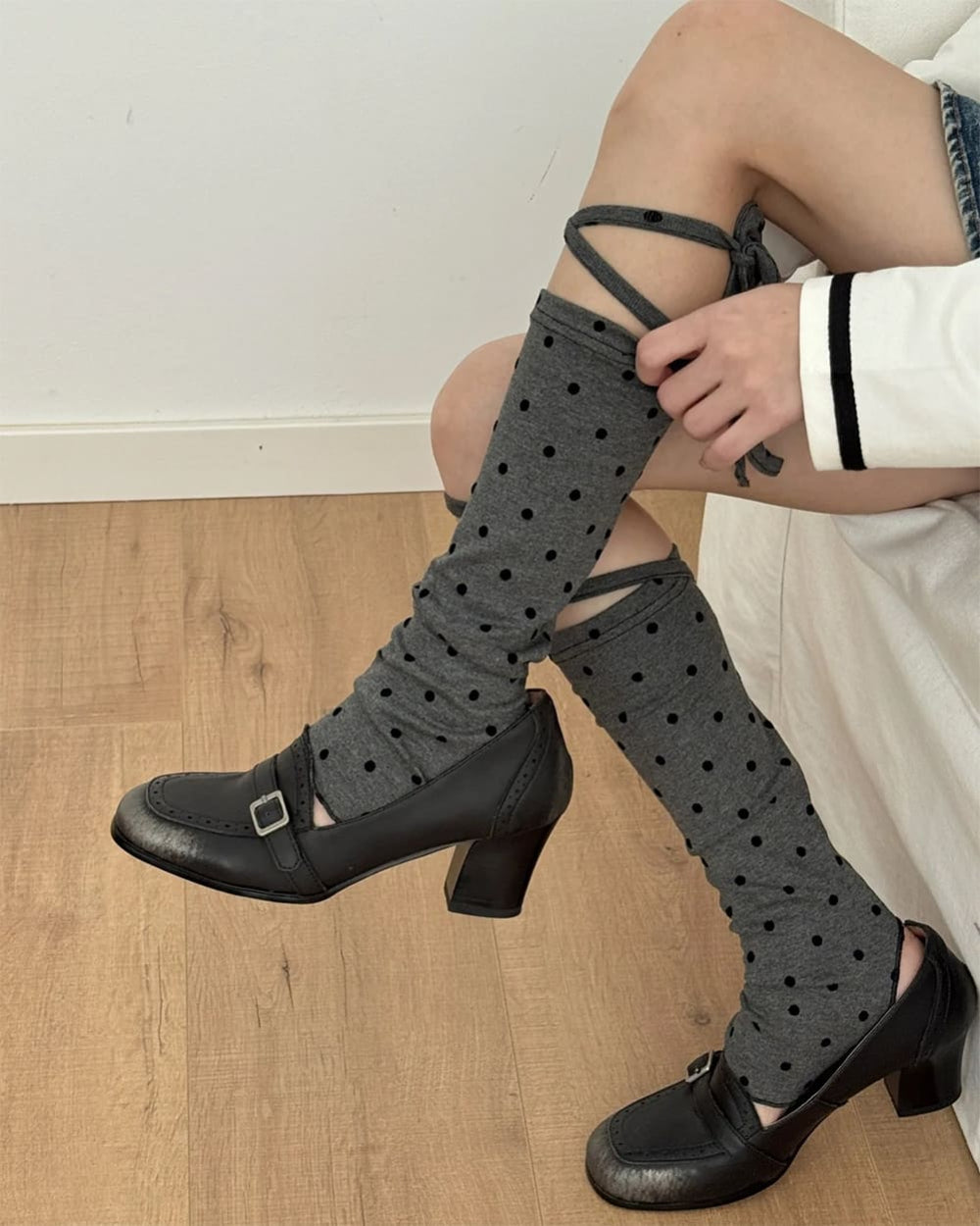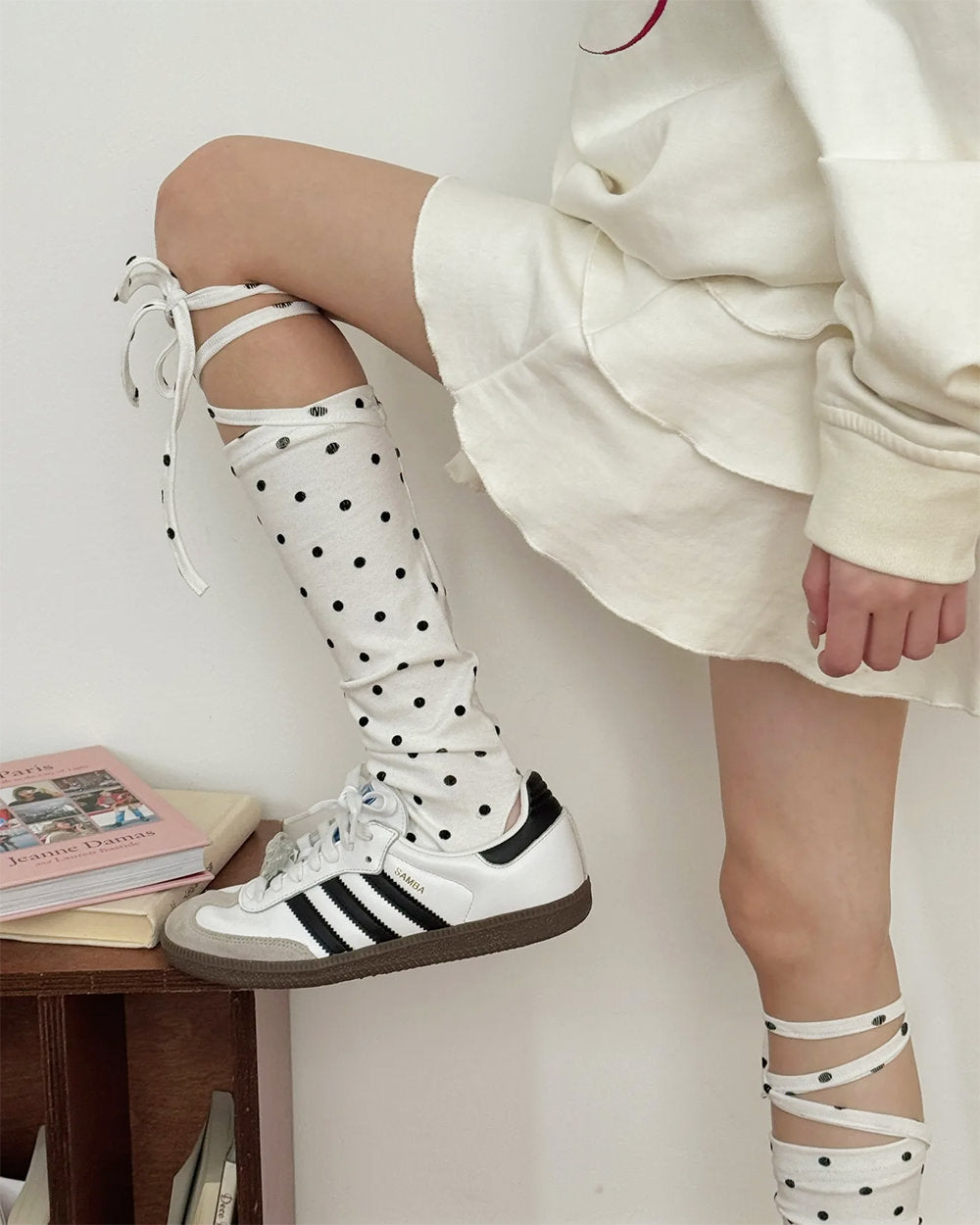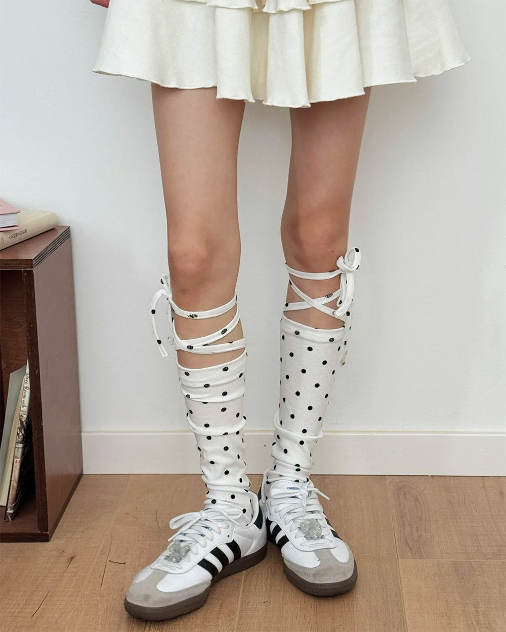 This aesthetic polka dot knee socks featuring stretch fabric with a classic dotted pattern and an open heel stirrup design
